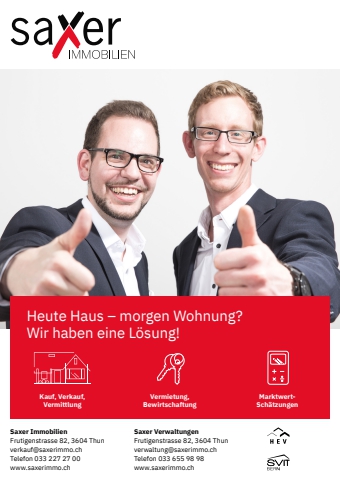 72 meine-region.ch ThemenberichteSaxer ImmobilienFrutigenstrasse 82, 3604 Thunverkauf@saxerimmo.chTelefon 033 227 27 00www.saxerimmo.chVermietung, BewirtschaftungMarktwertSch%u00e4tzungenKauf, Verkauf, VermittlungSaxer VerwaltungenFrutigenstrasse 82, 3604 Thunverwaltung@saxerimmo.chTelefon 033 655 98 98www.saxerimmo.chHeute Haus %u2013 morgen Wohnung? Wir haben eine L%u00f6sung!