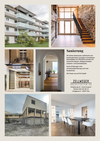 76 meine-region.ch ThemenberichteWir bieten ideenreiche, realistische und kostenoptimierte L%u00f6sungen zu komplexen Bauaufgaben f%u00fcr %u00f6ffentliche, private und historische Bauten, Altliegenschaften, Industrie- und Gewerbebauten.Unser Erfolg liegt in der Umsetzungserfahrung und in der Kostentreue.Wir freuen uns auf Ihr Projekt.info@za-ag.ch %u2022 www.za-ag.chTelefon 033 334 40 10L%u00e4nggasse 4 %u2022 3600 ThunSanierung