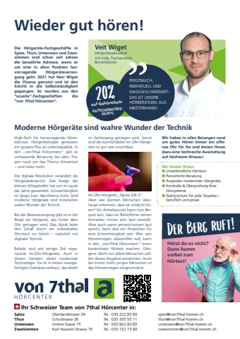 82 meine-region.ch ThemenberichteIhr Schweizer Team von 7thal H%u00f6rcenter in:Spiez Oberlandstrasse 39 Tel.: 033 222 83 83 spiez@von7thal-hoeren.chThun Schulstrasse 26 Tel.: 033 335 55 11 thun@von7thal-hoeren.chUnterseen Untere Gasse 15 Tel.: 033 822 83 83 unterseen@von7thal-hoeren.chZweisimmen Karl Haueter-Strasse 19 Tel.: 033 722 73 83 zweisimmen@von7thal-hoeren.chHigh-Tech f%u00fcr hervorragende H%u00f6rerlebnisse: H%u00f6rger%u00e4tetr%u00e4ger geniessen ein grosses Plus an Lebensqualit%u00e4t. In den %u201evon7thal H%u00f6rcentern%u201c gibt es umfassende Beratung bei allen Fragen rund um das Thema H%u00f6rverlust %u2013 und vieles mehr. Die digitale Revolution ver%u00e4ndert die H%u00f6rger%u00e4tebranche. Das Image der kleinen Alltagshelfer hat sich im Laufe der Jahre gewandelt. Schwerh%u00f6rigkeit ist l%u00e4ngst kein Tabuthema mehr. Und moderne H%u00f6rger%u00e4te sind inzwischen wahre Wunder der Technik. Bei der Basisversorgung gibt es in der Regel ein H%u00f6rger%u00e4t, das hinter dem Ohr getragen wird. Das Ger%u00e4t leitet den Schall durch ein individuelles Ohrst%u00fcck ins Geh%u00f6r %u2013 nat%u00fcrlich mit digitaler Technik. Beliebt sind seit einiger Zeit sogenannte Im-Ohr-H%u00f6rger%u00e4te. Auch in diesen Ger%u00e4ten steckt modernste Technologie. Sie ist in einem massgefertigten Geh%u00e4use verbaut, das direkt im Geh%u00f6rgang getragen wird. Somit sind die komfortablen Im-Ohr-H%u00f6rger%u00e4te so gut wie unsichtbar.Aber wie k%u00f6nnen Menschen %u00fcberhaupt erkennen, dass sie schlecht h%u00f6ren? Ein Anhaltspunkt kann zum Beispiel sein, dass ein Betroffener seinen Fernseher immer sehr laut einstellt. Aber auch wenn jemand extrem laut spricht, kann dies ein Anzeichen f%u00fcr eine Schwerh%u00f6rigkeit sein. Wer sein H%u00f6rverm%u00f6gen %u00fcberpr%u00fcfen will, kann in den %u201evon7thal H%u00f6rcentern%u201c einen kostenlosen H%u00f6rtest machen. %u00dcbrigens: Nicht nur %u00e4ltere Menschen sollten dieses Angebot annehmen. Auch bei immer mehr jungen Menschen ist das H%u00f6rverm%u00f6gen eingeschr%u00e4nkt.Wir haben in allen Belangen rund um gutes H%u00f6ren immer ein offenes Ohr f%u00fcr Sie und bieten Ihnen dazu eine technische Ausstattung auf h%u00f6chstem Niveau!Wir bieten Ihnen:%u25cf Unverbindliche H%u00f6rtests%u25cf Pers%u00f6nliche Beratung%u25cf Ausprobe modernster H%u00f6rger%u00e4te%u25cf Kontrolle & %u00dcberpr%u00fcfung Ihrer H%u00f6rsysteme%u25cf Geh%u00f6rschutz f%u00fcr jede Situation - beruflich und privatDie H%u00f6rger%u00e4te-Fachgesch%u00e4fte in Spiez, Thun, Unterseen und Zweisimmen sind schon seit Jahren die bew%u00e4hrte Adresse, wenn es um eine in allen Punkten hervorragende H%u00f6rger%u00e4teversorgung geht. 2021 hat Herr Wiget die Chance genutzt und ist den Schritt in die Selbstst%u00e4ndigkeit gegangen. So wurden aus den %u201cacustix%u201c-Fachgesch%u00e4ften die %u201cvon 7thal H%u00f6rcenter%u201d.Ihr Fachbetrieb f%u00fcr Geh%u00f6rschutz Bei uns erhalten Sie passenden Geh%u00f6rschutz, gesch%u00e4ftlich und privat. Wir beraten Sie gerne zu den verschiedenen M%u00f6glichkeiten und Ausf%u00fchrungen.Wieder gut h%u00f6ren!Moderne H%u00f6rger%u00e4te sind wahre Wunder der TechnikPERS%u00d6NLICH,INDIVIDUELL UNDMASSGESCHNEIDERT %u2013 DAS IST UNSERE H%u00d6RBERATUNG AUSMEISTERHAND!%u201eIm-Ohr-H%u00f6rger%u00e4t %u201eSignia Silk X%u201cVeit WigetH%u00f6rger%u00e4teakustikermit eidg. FachausweisBetriebsleiterDer Berg ruft!H%u00f6rst du es nicht?Dann komm vorbei zum H%u00f6rtest!20% auf Geh%u00f6rschutzGUTSCHEINCODE: GS20%