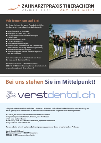 84 meine-region.ch ThemenberichteWir freuen uns auf Sie!Sie fi nden bei uns das ganze Angebot der Zahnmedizin unter einem Dach inkl. Zahntechnik. %u25cf Dentalhygiene, Prophylaxe%u25cf F%u00fcllungen, Kronen, Br%u00fccken%u25cf Chirurgie (Weisheitszahnentfernungen, Implantate)%u25cf Abnehmbare Prothetik%u25cf Kinderzahnmedizin%u25cf Vollnarkosebehandlungen%u25cf Ganzheitliche Zahnmedizin inkl. ern%u00e4hrungs- medizinischer Beratung (Ern%u00e4hrungsmedizin)%u25cf Neu Laserzahnbehandlungen%u25cf Abformung ganz einfach ohne W%u00fcrgerefl ex mit IntraoralscanIhre Zahnarztpraxis in Thierachern bei ThunDr. med. dent. Damiano MirraBlumensteinstrasse 7 I 3634 Thierachern 033 346 02 60 I info@zahnarztpraxis-thierachern.chwww.zahnarztpraxis-thierachern.chDie gute Zusammenarbeit zwischen Zahnarzt / Zahn%u00e4rztin und Zahntechniker/innen ist Voraussetzung f%u00fcr einen gelungenen Zahnersatz. In meinem Dentallabor werden folgende Produkte angeboten: %u25cf Kronen, Br%u00fccken aus Vollkeramik oder Metallkeramik%u25cf Implantatgest%u00fctzte Kronen, Br%u00fccken, und Prothesen%u25cf Teil- und Vollprothesen%u25cf Schienen, auch f%u00fcr Schnarch-Therapien, Sportschutzschienen%u25cf Reparaturen von ZahnersatzFerner arbeite ich mit weiteren Zahnarztpraxen zusammen. Gerne erwarte ich Ihre Anfrage.Verst-Dental CH GmbHBlumensteinstrasse 7 I 3634 Thierachern033 222 63 01 I www.verst-dental.chBei uns stehen Sie im Mittelpunkt!