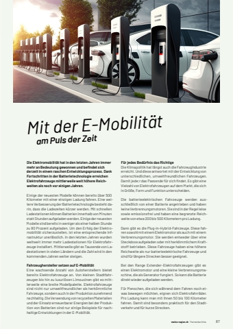 meine-region.ch meine-region.ch Themenberichte 871Mit der E-Mobilit%u00e4t am Puls der ZeitDie Elektromobilit%u00e4t hat in den letzten Jahren immer mehr an Bedeutung gewonnen und befi ndet sich derzeit in einem raschen Entwicklungsprozess. Dank Fortschritten in der Batterietechnologie erreichen Elektrofahrzeuge mittlerweile weit h%u00f6here Reichweiten als noch vor einigen Jahren. Einige der neuesten Modelle k%u00f6nnen bereits %u00fcber 500 Kilometer mit einer einzigen Ladung fahren. Eine weitere Verbesserung der Batterietechnologie besteht darin, dass die Ladezeiten k%u00fcrzer werden. Mit schnellen Ladestationen k%u00f6nnen Batterien innerhalb von Minuten statt Stunden aufgeladen werden. Einige der neuesten Modelle sind bereits in weniger als einer halben Stunde zu 80 Prozent aufgeladen. Um den Erfolg der Elektromobilit%u00e4t sicherzustellen, ist eine entsprechende Infrastruktur unerl%u00e4sslich. In den letzten Jahren wurden weltweit immer mehr Ladestationen f%u00fcr Elektrofahrzeuge installiert. Mittlerweile gibt es Tausende von Ladestationen in vielen L%u00e4ndern und die Zahl wird in den kommenden Jahren weiter steigen.Fahrzeughersteller setzen auf E-Mobilit%u00e4tEine wachsende Anzahl von Autoherstellern bietet bereits Elektrofahrzeuge an. Von kleinen Stadtfahrzeugen bis hin zu luxuri%u00f6sen Limousinen gibt es mittlerweile eine breite Modellpalette. Elektrofahrzeuge sind nicht nur umweltfreundlicher als herk%u00f6mmliche Fahrzeuge, sondern auch in der Produktion zunehmend nachhaltig. Die Verwendung von recycelten Materialien und der Einsatz erneuerbarer Energien bei der Produktion von Batterien sind nur einige Beispiele f%u00fcr nachhaltige Entwicklungen in der E-Mobilit%u00e4t.F%u00fcr jedes Bed%u00fcrfnis das RichtigeDie Klimapolitik hat l%u00e4ngst auch die Fahrzeugindustrie erreicht. Und diese antwortet mit der Entwicklung von unterschiedlichen, umweltfreundlichen Fahrzeugen. Damit jede:r das Passende f%u00fcr sich fi ndet. Es gibt eine Vielzahl von Elektrofahrzeugen auf dem Markt, die sich in Gr%u00f6%u00dfe, Form und Funktion unterscheiden. Die batterieelektrischen Fahrzeuge werden ausschlie%u00dflich von einer Batterie angetrieben und haben keine Verbrennungsmotoren. Sie sind in der Regel leise sowie emissionsfrei und haben eine begrenzte Reichweite von etwa 200 bis 500 Kilometern pro Ladung.Dann gibt es die Plug-in-Hybrid-Fahrzeuge. Diese fahren sowohl mit einem Elektromotor als auch mit einem Verbrennungsmotor. Sie werden entweder %u00fcber eine Steckdose aufgeladen oder mit herk%u00f6mmlichem Kraftstoff betrieben. Diese Fahrzeuge haben eine h%u00f6here Reichweite als nur batterieelektrische Fahrzeuge und sind f%u00fcr l%u00e4ngere Strecken besser geeignet.Bei den Range Extender-Elektrofahrzeugen gibt es einen Elektromotor und eine kleine Verbrennungsmaschine, die als Generator fungiert. So kann die Batterie direkt wieder aufgeladen werden. F%u00fcr Menschen, die sich w%u00e4hrend dem Fahren noch etwas bewegen m%u00f6chten, eignen sich Elektrofahrr%u00e4der. Pro Ladung kann man mit ihnen 50 bis 100 Kilometer fahren. Damit sind besonders praktisch f%u00fcr den Stadtverkehr und f%u00fcr kurze Strecken. Unsere Mission: Immer weniger Emissionen. Dies k%u00f6nnen wir schaffen mit dem Ioniq 5 MY 22. Neue Funktionen, z. B. das Erw%u00e4rmen der Batterie vor dem Schnellladen sowie eine 77.4 kWh-Batterie tragen zu weniger Emissionen bei. %u00dcberzeugen Sie sich selbst bei uns %u2013 Ihrem offiziellen Hyundai Partner seit %u00fcber 30 Jahren in der Region Thun:Garage Ullmann AGIndustriestrasse 93661 UetendorfTel. 033 345 52 52www.garage-ullmann.chUnsere Mission: Immer weniger Emissionen. Dies k%u00f6nnen wir schaffen mit dem Ioniq 5 MY 22. Neue Funktionen, z. B. das Erw%u00e4rmen der Batterie vor dem Schnellladen sowie eine 77.4 kWh-Batterie tragen zu weniger Emissionen bei. %u00dcberzeugen Sie sich selbst bei uns %u2013 Ihrem offiziellen Hyundai Partner seit %u00fcber 30 Jahren in der Region Thun:Garage Ullmann AGIndustriestrasse 93661 UetendorfTel. 033 345 52 52www.garage-ullmann.chUnsere Mission: Immer weniger Emissionen. Dies k%u00f6nnen wir schaffen mit dem Ioniq 5 MY 22. Neue Funktionen, z. B. das Erw%u00e4rmen der Batterie vor dem Schnellladen sowie eine 77.4 kWh-Batterie tragen zu weniger Emissionen bei. %u00dcberzeugen Sie sich selbst bei uns %u2013 Ihrem offiziellen Hyundai Partner seit %u00fcber 30 Jahren in der Region Thun:Garage Ullmann AGIndustriestrasse 93661 UetendorfTel. 033 345 52 52www.garage-ullmann.chUnsere Mission: Immer weniger Emissionen. Dies k%u00f6nnen wir schaffen mit dem Ioniq 5 MY 22. Neue Funktionen, z. B. das Erw%u00e4rmen der Batterie vor dem Schnellladen sowie eine 77.4 kWh-Batterie tragen zu weniger Emissionen bei. %u00dcberzeugen Sie sich selbst bei uns %u2013 Ihrem offiziellen Hyundai Partner seit %u00fcber 30 Jahren in der Region Thun:Garage Ullmann AGIndustriestrasse 93661 UetendorfTel. 033 345 52 52www.garage-ullmann.chUnsere Mission: Immer weniger Emissionen. Dies k%u00f6nnen wir schaffen mit dem Ioniq 5 MY 22. Neue Funktionen, z. B. das Erw%u00e4rmen der Batterie vor dem Schnellladen sowie eine 77.4 kWh-Batterie tragen zu weniger Emissionen bei. %u00dcberzeugen Sie sich selbst bei uns %u2013 Ihrem offiziellen Hyundai Partner seit %u00fcber 30 Jahren in der Region Thun:Garage Ullmann AGIndustriestrasse 93661 UetendorfTel. 033 345 52 52www.garage-ullmann.ch