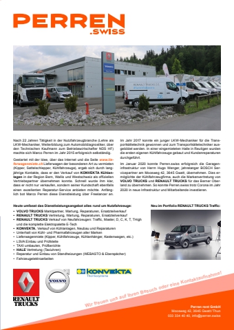 meine-region.ch Themenberichte 89Perren rent GmbHMoosweg 42, 3645 Gwatt / Thun033 334 40 40, info@perren.swissWir freuen uns auf Ihren Besuch oder eine Kontaktaufnahme!Heute umfasst das Dienstleistungsangebot alles rund um Nutzfahrzeuge: Neu im Portfolio RENAULT TRUCKS Traffi c:%u2022 VOLVO TRUCKS Marktpartner, Wartung, Reparaturen, Ersatzteilverkauf%u2022 RENAULT TRUCKS Vertretung, Wartung, Reparaturen, Ersatzteilverkauf%u2022 RENAULT TRUCKS Verkauf von Neufahrzeugen: Traffi c, Master, D, C, K, T, THigh und die komplette Elektropalette E-Tech%u2022 KONVEKTA, Verkauf von K%u00fchlanlagen, Neubau und Reparaturen%u2022 Unterhalt von K%u00fchl- und Pharmafahrzeugen aller Marken%u2022 Lieferwagenmiete (Kipper, K%u00fchlfahrzeuge, K%u00fchlanh%u00e4nger, Kastenwagen, etc.)%u2022 LSVA Einbau und Pr%u00fcfstelle%u2022 TAXI umbauten, Pr%u00fcfberichte%u2022 HALE Vertretung (Taxiuhren)%u2022 Reparatur und Einbau von Standheizungen (WEBASTO & Ebersp%u00e4cher)%u2022 FahrzeugelektroarbeitenNach 22 Jahren T%u00e4tigkeit in der Nutzfahrzeugbranche (Lehre als LKW-Mechaniker, Weiterbildung zum Automobildiagnostiker, %u00fcber den Technischen Kaufmann zum Betriebswirtschafter NDS HF) machte sich Marco Perren im Jahr 2015 erfolgreich selbst%u00e4ndig.Gestartet mit der Idee, %u00fcber das Internet und die Seite www.lieferwagenmiete.ch Lieferwagen der besonderen Art zu vermieten (Kipper, Sattelschlepper, K%u00fchlfahrzeuge), ergab sich durch langj%u00e4hrige Kontakte, dass er den Verkauf von KONVEKTA K%u00fchlanlagen in der Region Bern, Wallis und Westschweiz als offi ziellen Vertriebspartner %u00fcbernehmen konnte. Schnell wurde ihm klar, dass er nicht nur verkaufen, sondern seiner Kundschaft ebenfalls einen exzellenten Reparatur-Service anbieten m%u00f6chte. Anf%u00e4nglich bot Marco Perren diese Dienstleistung %u00fcber Freelancer an. Im Jahr 2017 konnte ein junger LKW-Mechaniker f%u00fcr die Transportk%u00e4ltetechnik gewonnen und zum Transportk%u00e4ltetechniker ausgebildet werden. In einer eingemieteten Halle in Reutigen wurden die ersten eigenen K%u00fchlfahrzeuge gebaut und Kundenreparaturen durchgef%u00fchrt.Im Januar 2020 konnte Perren.swiss erfolgreich die Garageninfrastruktur von Herrn Hugo Wenger, jahrelanger BOSCH Servicepartner am Moosweg 42, 3645 Gwatt, %u00fcbernehmen. Dies erm%u00f6glichte der K%u00fchlfahrzeugfi rma, auch die Markenvertretung von VOLVO TRUCKS und RENAULT TRUCKS f%u00fcr das Berner Oberland zu %u00fcbernehmen. So konnte Perren.swiss trotz Corona im Jahr 2020 in neue Infrastruktur und Mitarbeitende investieren.
