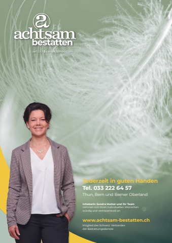 Jederzeit in guten H%u00e4ndenTel. 033 222 64 57Thun, Bern und Berner OberlandInhaberin Sandra Matter und ihr Team nehmen sich Ihren individuellen W%u00fcnschen w%u00fcrdig und vertrauensvoll anwww.achtsam-bestatten.chMitglied des Schweiz. Verbandes der Bestattungsdienste