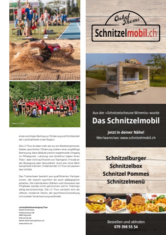 meine-region.ch Vereine 25Leichtathletikvereinigung ThunDaniel EschmannFeldenstrasse%u0009363655%u0009Sigriswil079%u0009442%u000994%u000900daniel.eschmann@lvthun.chwww.lvthun.cheinen wichtigen Beitrag zur F%u00f6rderung und Sichtbarkeit der Leichtathletik in der Region.Die LV Thun ist aber mehr als nur ein Wettkampfverein. Neben sportlicher F%u00f6rderung stehen eine sorgf%u00e4ltige Betreuung, klare Abl%u00e4ufe und ein respektvoller Umgang im Mittelpunkt. Leistung und Ambition haben ihren Platz %u2013 aber nicht auf Kosten von Teamgeist, Freude an der Bewegung oder Gesundheit. Auch wer ohne Wettkampfziele trainiert, fi ndet bei der LV Thun ein passendes Umfeld.Das Trainerteam besteht aus qualifi zierten Fachpersonen, die sowohl sportlich als auch p%u00e4dagogisch arbeiten. Die individuellen St%u00e4rken und Interessen der Mitglieder werden ernst genommen und im Trainingsalltag ber%u00fccksichtigt. Die LV Thun versteht sich als offener, moderner Verein, der sportliche Entwicklung mit sozialer Verantwortung verbindet.Team%u0009LV%u0009ThunFabio%u0009Luginb%u00fchl%u0009beim%u0009WeitsprungInserat halbseitig, 101 x 297 mmAus der %u00abSchnitzelscheune Wimmis%u00bb wurde Das SchnitzelmobilJetzt in deiner N%u00e4he!Wer/wann/wo: www.schnitzelmobil.chSchnitzelburgerSchnitzelboxSchnitzel PommesSchnitzelmen%u00fcBestellen und abholen 079 398 55 54