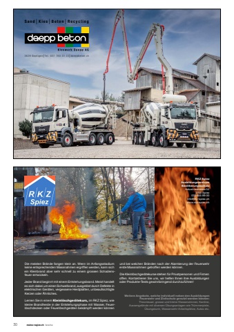 30 meine-region.ch VereineDie meisten Br%u00e4nde fangen klein an. Wenn im Anfangsstadium keine entsprechenden Massnahmen ergriffen werden, kann sich ein Kleinbrand aber sehr schnell zu einem grossen Schadensfeuer entwickeln. Jeder Brand beginnt mit einem Entstehungsbrand. Meist handelt es sich dabei um einen Schwelbrand, ausgel%u00f6st durch Defekte in elektrischen Ger%u00e4ten, vergessene Herdplatten, unbeaufsichtigte Kerzen oder %u00c4hnliches. Lernen Sie in einem Kleinl%u00f6schger%u00e4tekurs, im RKZ Spiez, wie kleine Brandherde in der Entstehungsphase mit Wasser, Feuerl%u00f6schdecken oder Feuerl%u00f6schger%u00e4ten bek%u00e4mpft werden k%u00f6nnen und bei welchen Br%u00e4nden nach der Alarmierung der Feuerwehr erste Massnahmen getroffen werden k%u00f6nnen.Die Kleinl%u00f6schger%u00e4tekurse stehen f%u00fcr Privatpersonen und Firmen offen. Kontaktieren Sie uns, wir helfen Ihnen ihre Ausbildungen oder Produkte-Tests gewinnbringend durchzuf%u00fchren!RKZ SpiezAusbildungszentrum Bev%u00f6lkerungsschutzIndustriestrasse 543700 Spiez033 655 89 00info@rkz-spiez.chwww.rkz-spiez.chWeitere Angebote, welche individuell neben den Ausbildungen Feuerwehr und Zivilschutz genutzt werden k%u00f6nnen: Theoriesaal, grosse und kleine Klassenzimmer, Kantine, Aussengel%u00e4nde mit diversen %u00dcbungsanlagen wie Tr%u00fcmmerpiste, %u00dcbungsturm, Wasserwehr-Arbeitspl%u00e4tze, Autos etc.Sand %u2502 Kies %u2502 Beton %u2502 Recycling3629 Oppligen%u2502Tel. 031 780 22 22%u2502daeppbeton.ch
