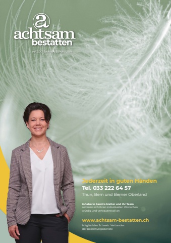 40 meine-region.ch VereineJederzeit in guten H%u00e4ndenTel. 033 222 64 57Thun, Bern und Berner OberlandInhaberin Sandra Matter und ihr Team nehmen sich Ihren individuellen W%u00fcnschen w%u00fcrdig und vertrauensvoll anwww.achtsam-bestatten.chMitglied des Schweiz. Verbandes der Bestattungsdienste