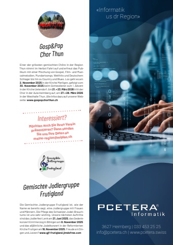 meine-region.ch Vereine 45meine-region.ch Vereine 2Gemischte Jodlergruppe Frutigland Gosp&PopChor ThunEiner der gr%u00f6ssten gemischten Ch%u00f6re in der Region Thun nimmt im Herbst Fahrt auf und erfreut das Publikum mit einer Mischung von Gospel, Film- und Musicalmelodien, Mundartsongs, Welthits und Deutschem Schlager bis hin zu Country und Blues. Los geht es am 2. November 2025 in der Kirche Merligen, gefolgt vom 30. November 2025 beim Gottesdienst zum 1. Advent in der Kirche Uetendorf. Am 21. + 23. M%u00e4rz 2026 tritt der Chor in der Aula Heimberg auf, am 27. + 28. M%u00e4rz 2026in der Westhalle Thun. Alle Infos dazu auf unserer Webseite: www.gospopchorthun.chDie Gemischte Jodlergruppe Frutigland ist, wie der Name es bereits sagt, eine Jodlergruppe mit Frauen und M%u00e4nnern. Die Pfl ege des Schweizer Jodel-Brauchtums ist uns sehr wichtig. Unsere n%u00e4chsten Auftritte sind das Jodlerfest Lenk am 21. Juni 2025, das Gedenkkonzert Emil Herzog in B%u00f6nigen am 8. November 2025 und das allj%u00e4hrliche Jodelkonzert in der Reformierten Kirche Frutigen am 16. November 2025. Freude am Singen und Jutzen? www.gj f-frutigland.jimdofree.comInteressiert?M%u00f6chten auch Sie Ihren Verein pr%u00e4sentieren? Dann senden Sie uns Ihre Daten an meine-region@miplan.chInserat halbseitig, 101 x 297 mm3627 Heimberg | 033 453 25 25 info@pcetera.ch | www.pcetera.swiss%u00abInformatik us dr Region%u00bb
