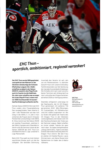 meine-region.ch meine-region.ch Vereine 471 EHC Thun %u2013sportlich, ambitioniert, regional verankertDer EHC Thun wurde 1936 gegr%u00fcndet und spielt bei den M%u00e4nnern in der h%u00f6chsten Amateurliga der Schweiz (MyHockey League). Die %u00abGiel%u00e4%u00bb schafften es dabei in der Saison 2023/24 sowohl in den Playoffs als auch im Cup bis ins die Halbfi nals. Ein Jahr zuvor schaffte man es sogar bis in den Playoff-Final, in dem man vor 2500 Zuschauenden im ausverkauften Grabengut aufl aufen durfte. Seit der Saison 2023/24 f%u00fchrt der EHC Thun zudem eine Frauenabteilung. Das neugegr%u00fcndete Team feierte in Jahr 1 den Meistertitel und den Aufstieg in die SWHL C. In Jahr 2 marschierten die Frauen durch: Erneuter Meistertitel und Aufstieg in die SWHL B. Hinzu kommt auf die Saison 25/26 ein zweites Frauenteam, welches in der SWHL D spielen wird. Ebenfalls im Verein sind die Senioren sowie ab der Saison 2025/26 der EHC Thun-Lerchenfeld mit einer 3. Liga- und einer 4. Liga-Mannschaft.Beim EHC Thun geht es trotz hohem sportlichen Niveau auch um die Geselligkeit. Die famili%u00e4re Stimmung innerhalb des Vereins ist seit Jahren ein Markenzeichen. In n%u00e4chster Zukunft freut sich unsere EishockeyFamilie besonders auf die Sanierung der maroden Kunsteisbahn Grabengut. Die Eishalle wird nach zwei verschobenen Terminen seit Anfang April saniert und sollte den Eissportvereinen ab Herbst 2026 zur Verf%u00fcgung stehen.Ebenfalls erfolgreich unterwegs ist der Nachwuchs, der im HC Dragon Thun gemeinsam mit weiteren Tr%u00e4gervereinen (EHC Wiki-M%u00fcnsingen, SC Freimettigen, HC M%u00fchlethurnen und EHC H%u00f6fen) organisiert ist. Bis zur Stufe U16 spielen die Teams des HC Dragon Thun in der h%u00f6chsten Leistungsklasse und messen sich mit den Nachwuchsteams der Clubs aus der National League. Dabei schaffen es immer wieder Talente bis ganz nach oben. So haben beispielsweise Joshua Fahrni (SCL Tigers) und Alain Graf (SC Bern) das Eishockey beim HC Dragon Thun erlernt. Bei den Frauen stehen mit Saskia Maurer, Laura Zimmermann und Alena Rossel drei Spielerinnen im Kader des A-Nationalteams. EHC Thun Bierigutstrasse%u0009143608%u0009Thun079%u0009740%u000900%u000990admin@ehcthun.chwww.ehcthun.ch