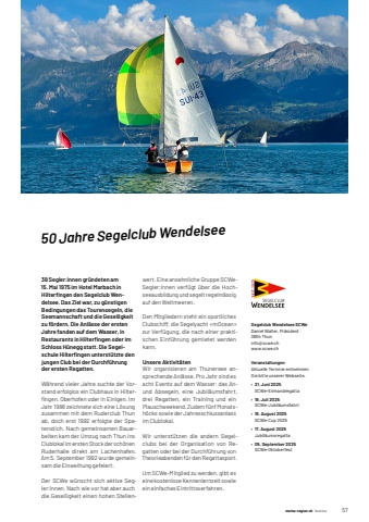 meine-region.ch meine-region.ch Vereine 57150 Jahre Segelclub Wendelsee38 Segler:innen gr%u00fcndeten am 15. Mai 1975 im Hotel Marbach in Hilterfi ngen den Segelclub Wendelsee. Das Ziel war, zu g%u00fcnstigen Bedingungen das Tourensegeln, die Seemannschaft und die Geselligkeit zu f%u00f6rdern. Die Anl%u00e4sse der ersten Jahre fanden auf dem Wasser, in Restaurants in Hilterfi ngen oder im Schloss H%u00fcnegg statt. Die Segelschule Hilterfi ngen unterst%u00fctzte den jungen Club bei der Durchf%u00fchrung der ersten Regatten.W%u00e4hrend vieler Jahre suchte der Vorstand erfolglos ein Clubhaus in Hilterfi ngen, Oberhofen oder in Einigen. Im Jahr 1988 zeichnete sich eine L%u00f6sung zusammen mit dem Ruderclub Thun ab, doch erst 1992 erfolgte der Spatenstich. Nach gemeinsamen Bauarbeiten kam der Umzug nach Thun ins Clublokal im ersten Stock der sch%u00f6nen Ruderhalle direkt am Lachenhafen. Am 5. September 1992 wurde gemeinsam die Einweihung gefeiert.Der SCWe w%u00fcnscht sich aktive Segler:innen. Nach wie vor hat aber auch die Geselligkeit einen hohen Stellenwert. Eine ansehnliche Gruppe SCWeSegler:innen verf%u00fcgt %u00fcber die Hochseeausbildung und segelt regelm%u00e4ssig auf den Weltmeeren.Den Mitgliedern steht ein sportliches Clubschiff, die Segelyacht %u00abmOcean%u00bb zur Verf%u00fcgung, die nach einer praktischen Einf%u00fchrung gemietet werden kann.Unsere Aktivit%u00e4tenWir organisieren am Thunersee ansprechende Anl%u00e4sse. Pro Jahr sind es acht Events auf dem Wasser: das Anund Absegeln, eine Jubil%u00e4umsfahrt, drei Regatten, ein Training und ein Plauschweekend. Zudem f%u00fcnf Monatsh%u00f6cks sowie der Jahresschlussanlass im Clublokal.Wir unterst%u00fctzen die andern Segelclubs bei der Organisation von Regatten oder bei der Durchf%u00fchrung von Theorieabenden f%u00fcr den Regattasport.Um SCWe-Mitglied zu werden, gibt es eine kostenlose Kennenlernzeit sowie ein einfaches Eintrittsverfahren.Segelclub Wendelsee SCWeDaniel Walter, Pr%u00e4sident3604%u0009Thuninfo@scwe.chwww.scwe.chVeranstaltungenAktuelle%u0009Termine%u0009entnehmen%u0009Sie%u0009bitte%u0009unserer%u0009Webseite.%u2022 21. Juni 2025SCWe-Einhandregatta%u2022 19. Juli 2025SCWe-Jubil%u00e4umsfahrt%u2022 16. August 2025SCWe-Cup%u00092025%u2022 17. August 2025Jubil%u00e4umsregatta%u2022 05. September 2025SCWe-Oktoberfest