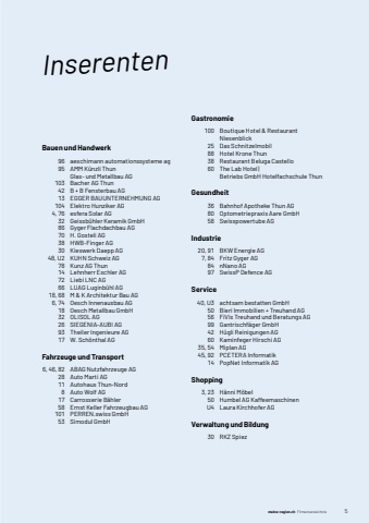 meine-region.ch Firmenverzeichnis 5Bauen und Handwerk%u0009 96%u0009 aeschimann automationssysteme ag%u0009 95%u0009 AMM K%u00fcnzli Thun%u0009 %u0009 Glas- und Metallbau AG%u0009 103%u0009 Bacher AG Thun%u0009 42%u0009 B + B Fensterbau AG%u0009 13%u0009 EGGER BAUUNTERNEHMUNG AG%u0009 104%u0009 Elektro Hunziker AG%u0009 4, 76%u0009 esfera Solar AG%u0009 32%u0009 Geissb%u00fchler Keramik GmbH%u0009 86%u0009 Gyger Flachdachbau AG%u0009 70%u0009 H. Gosteli AG%u0009 38%u0009 HWB-Finger AG%u0009 30%u0009 Kieswerk Daepp AG%u0009 48, U2%u0009 KUHN Schweiz AG%u0009 78%u0009 Kunz AG Thun%u0009 14%u0009 Lehnherr Eschler AG%u0009 72%u0009 Liebi LNC AG%u0009 66%u0009 LUAG Luginb%u00fchl AG%u0009 18, 68%u0009 M & K Architektur Bau AG%u0009 6, 74%u0009 Oesch Innenausbau AG%u0009 18%u0009 Oesch Metallbau GmbH%u0009 32%u0009 OLISOL AG%u0009 26%u0009 SIEGENIA-AUBI AG%u0009 93%u0009 TheilerIngenieure AG%u0009 17%u0009 W. Sch%u00f6nthal AGFahrzeuge und Transport%u00096, 46, 82%u0009 ABAG Nutzfahrzeuge AG%u0009 28%u0009 Auto Marti AG%u0009 11%u0009 Autohaus Thun-Nord%u0009 8%u0009 Auto Wolf AG%u0009 17%u0009 Carrosserie B%u00e4hler%u0009 58%u0009 Ernst Keller Fahrzeugbau AG%u0009 101%u0009 PERREN.swiss GmbH%u0009 53%u0009 Simodul GmbHGastronomie%u0009 100%u0009 Boutique Hotel & Restaurant Niesenblick%u0009 25%u0009 Das Schnitzelmobil%u0009 88%u0009 Hotel Krone Thun%u0009 38%u0009 Restaurant Beluga Castello%u0009 60%u0009 The Lab Hotel |%u0009 %u0009 Betriebs GmbH Hotelfachschule ThunGesundheit%u0009 36%u0009 Bahnhof Apotheke Thun AG%u0009 80%u0009 Optometriepraxis Aare GmbH%u0009 58%u0009 Swisspowertube AGIndustrie%u0009 20, 91%u0009 BKW Energie AG%u0009 7, 84%u0009 Fritz Gyger AG%u0009 84%u0009 nNano AG%u0009 97%u0009 SwissP Defence AGService%u0009 40, U3%u0009 achtsam bestatten GmbH%u0009 50%u0009 Bieri Immobilien + Treuhand AG%u0009 56%u0009 FiVis Treuhand und Beratungs AG%u0009 99%u0009 Gantrischf%u00e4ger GmbH%u0009 42%u0009 H%u00fcgli Reinigungen AG%u0009 60%u0009 Kaminfeger Hirschi AG%u0009 35, 54%u0009 Miplan AG%u0009 45, 92%u0009 PCETERA Informatik%u0009 14%u0009 PopNetInformatik AGShopping%u0009 3, 23%u0009 H%u00e4nni M%u00f6bel%u0009 50%u0009 Humbel AG Kaffeemaschinen%u0009 U4%u0009 Laura Kirchhofer AGVerwaltung und Bildung%u0009 30%u0009 RKZ SpiezInserenten