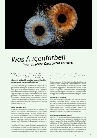 meine-region.ch meine-region.ch Themenberichte 81Was Augenfarben %u00fcber unseren Charakter verratenSeit jeher faszinieren uns die Augen eines Menschen. Sie gelten als Spiegel der Seele, als Fenster zu unseren innersten Gedanken und Gef%u00fchlen. Doch k%u00f6nnen sie tats%u00e4chlich mehr %u00fcber unseren Charakter verraten als nur momentane Emotionen? Die Farbe unserer Augen wird in erster Linie durch die genetische Veranlagung bestimmt. Das Pigment Melanin spielt dabei die entscheidende Rolle. Eine hohe Konzentration f%u00fchrt zu braunen Augen, w%u00e4hrend geringere Mengen Blau oder Gr%u00fcn hervorbringen. Diese genetische Lotterie scheint auf den ersten Blick wenig mit unseren Charaktereigenschaften gemein zu haben. Dennoch gibt es interessante Beobachtungen und sogar einige wissenschaftliche Ans%u00e4tze, die eine subtile Verbindung andeuten.Braun, blau oder gr%u00fcn?So werden beispielsweise Menschen mit braunen Augen oft als dominant, selbstbewusst und durchsetzungsstark wahrgenommen. Studien deuten darauf hin, dass sie in direkten Konfrontationen tendenziell als glaubw%u00fcrdiger und %u00fcberzeugender eingesch%u00e4tzt werden. Gleichzeitig werden sie manchmal auch als weniger sanftm%u00fctig oder einf%u00fchlsam wahrgenommen. Menschen mit blauen Augen hingegen werden oft mit Eigenschaften wie Sanftheit, Freundlichkeit und Offenheit assoziiert. Sie gelten als kreativ, intelligent und friedliebend. Einige Studien legen nahe, dass Menschen mit helleren Augen eine h%u00f6here Schmerztoleranz haben k%u00f6nnten und tendenziell weniger anf%u00e4llig f%u00fcr Depressionen sind. Gr%u00fcne Augen, die oft als geheimnisvoll und faszinierend gelten, werden h%u00e4ufi g mit Eigenschaften wie Leidenschaft, Entschlossenheit und einem starken Willen in Verbindung gebracht. Menschen mit gr%u00fcnen Augen sollen eine gewisse Balance zwischen Durchsetzungsverm%u00f6gen und Empathie besitzen. Sie gelten als unabh%u00e4ngig, kreativ und geniessen es, neue Wege zu gehen.Die Sache ist komplexerEs ist entscheidend zu betonen, dass die oben genannten Einsch%u00e4tzungen lediglich statistische Beobachtungen sind und individuelle Unterschiede enorm sein k%u00f6nnen. Zudem ist unser Charakter ein komplexes Zusammenspiel vieler Faktoren, darunter Erziehung, Erfahrungen und Umfeld. Die Augenfarbe allein kann hier keine abschliessenden R%u00fcckschl%u00fcsse zulassen.Kein wissenschaftlicher BefundDennoch ist es faszinierend, wie tief verwurzelt die Idee einer Verbindung zwischen Augenfarbe und Charakter in unserer Vorstellungswelt ist. Die Wissenschaft steht einer direkten kausalen Verbindung zwischen Augenfarbe und spezifi schen Charaktermerkmalen eher skeptisch gegen%u00fcber. Zwar gibt es einige Studien, die interessante Korrelationen aufzeigen, doch diese sind oft klein und lassen keine eindeutigen Schl%u00fcsse zu.