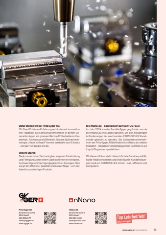 meine-region.ch Top Lehrbetrieb 85meine-region.ch Top Lehrbetriebe 2nNano AGBodmerstrasse%u0009123645%u0009Gwatt033%u0009334%u000924%u000900sales@nnano.comwww.nnano.chFritz Gyger AGBodmerstrasse%u0009123645%u0009Gwatt033%u0009336%u000922%u000977sales@fgyger.chwww.fgyger.chDaf%u00fcr stehen wir bei Fritz Gyger AG:Mit %u00fcber 65 Jahren Erfahrung verbinden wir Innovation mit Tradition. Als Familienunternehmen in dritter Generation legen wir grossen Wert auf Mitarbeiterzufriedenheit, Fairness und Offenheit. Unsere Spitzentechnologie %u201eMade in Gwatt%u201c kommt weltweit zum Einsatz %u2013 von der Tiefsee bis ins All.Unsere St%u00e4rke:Dank modernster Technologien, eigener Entwicklung und Fertigung unter einem Dach schaffen wir einfache, hochwertige und fertigungsgerechte L%u00f6sungen. Das sorgt f%u00fcr Effi zienz, Qualit%u00e4t und kurze Wege %u2013 von der Idee bis zum fertigen Produkt.Die nNano AG %u2013 Spezialisiert auf CERTUS FLEXIm Jahr 2024 von der Familie Gyger gegr%u00fcndet, wurde die nNano AG ins Leben gerufen, um den steigenden Anforderungen der wachsenden CERTUS FLEX Kundschaft gerecht zu werden. Als Schwesterunternehmen der Fritz Gyger AG befi ndet sich nNano am selben Standort %u2013 ist jedoch vollst%u00e4ndig auf den CERTUS FLEX Liquid Dispenser spezialisiert.Mit diesem Fokus stellt nNano h%u00f6chste Servicequalit%u00e4t, kurze Reaktionszeiten und individuelle Kundenl%u00f6sungen rund um CERTUS FLEX sicher %u2013 nah, effi zient und kompetent.