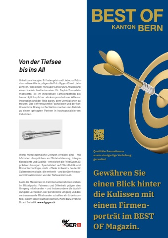 meine-region.ch Inhalt 7Von der Tiefsee bis ins AllUnhaltbare Neugier, Erfi ndergeist und Liebe zur Pr%u00e4zision %u2013 diese Werte pr%u00e4gen die Fritz Gyger AG seit Jahrzehnten. Was einst Fritz Gyger Senior zur Entwicklung eines Nadelschleifautomaten f%u00fcr Saphir-Tonnadeln motivierte, ist im innovativen Familienbetrieb bis heute t%u00e4glich sp%u00fcrbar: ein kompromissloser Wille zur Innovation und der Reiz daran, dem Unm%u00f6glichen zu trotzen. Das tief verwurzelte Fachwissen und der kontinuierliche Drang zur Perfektion machen den Betrieb zu einem gefragten Partner in hochspezialisierten Industrien.Wenn mikrotechnische Grenzen erreicht sind %u2013 mit h%u00f6chsten Anspr%u00fcchen an Miniaturisierung, Integrationsdichte und Qualit%u00e4t %u2013 entwickelt die Fritz Gyger AG pr%u00e4zise L%u00f6sungen. Spezialisiert auf Mikrofl uidik und Dosiertechnologie, steht %u00abMade in Gwatt%u00bb heute f%u00fcr Spitzentechnologie, die weltweit %u2013 und dar%u00fcber hinaus %u2013 zum Einsatz kommt: von der Tiefsee bis ins All.Auch die Menschen im Familienunternehmen stehen im Mittelpunkt: Fairness und Offenheit pr%u00e4gen den Umgang miteinander %u2013 und insbesondere die Ausbildung der Lernenden. Der pers%u00f6nliche Umgang und das vertrauensvolle Miteinander schaffen ein Arbeitsumfeld, in dem Ideen wachsen k%u00f6nnen. Mehr dazu erf%u00e4hrst Du auf Seite 84. www.fgyger.chInserat halbseitig, 101 x 297 mmGew%u00e4hren Sie einen Blick hinter die Kulissen mit einem Firmenportr%u00e4t im BEST OF Magazin.BERNQualit%u00e4ts-Journalismus sowie einzigartige Verteilung garantiert