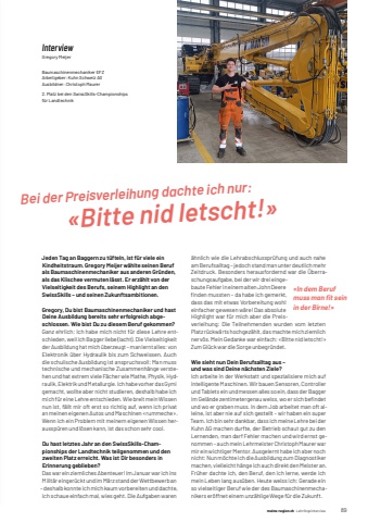 meine-region.ch Lehrlingsinterview 89Bei der Preisverleihung dachte ich nur: %u00abBitte nid letscht!%u00bbJeden Tag an Baggern zu t%u00fcfteln, ist f%u00fcr viele ein Kindheitstraum. Gregory Meij er w%u00e4hlte seinen Beruf als Baumaschinenmechaniker aus anderen Gr%u00fcnden, als das Klischee vermuten l%u00e4sst. Er erz%u00e4hlt von der Vielseitigkeit des Berufs, seinem Highlight an den SwissSkills %u2013 und seinen Zukunftsambitionen.Gregory, Du bist Baumaschinenmechaniker und hast Deine Ausbildung bereits sehr erfolgreich abgeschlossen. Wie bist Du zu diesem Beruf gekommen?Ganz ehrlich: Ich habe mich nicht f%u00fcr diese Lehre entschieden, weil ich Bagger liebe (lacht). Die Vielseitigkeit der Ausbildung hat mich %u00fcberzeugt %u2013 man lernt alles: von Elektronik %u00fcber Hydraulik bis zum Schweissen. Auch die schulische Ausbildung ist anspruchsvoll: Man muss technische und mechanische Zusammenh%u00e4nge verstehen und hat extrem viele F%u00e4cher wie Mathe, Physik, Hydraulik, Elektrik und Metallurgie. Ich habe vorher das Gymi gemacht, wollte aber nicht studieren, deshalb habe ich mich f%u00fcr eine Lehre entschieden. Wie breit mein Wissen nun ist, f%u00e4llt mir oft erst so richtig auf, wenn ich privat an meinen eigenen Autos und Maschinen %u00abrummeche%u00bb. Wenn ich ein Problem mit meinem eigenen Wissen heraussp%u00fcren und l%u00f6sen kann, ist das schon sehr cool.Du hast letztes Jahr an den SwissSkills-Championships der Landtechnik teilgenommen und den zweiten Platz erreicht. Was ist Dir besonders in Erinnerung geblieben?Das war ein ziemliches Abenteuer! Im Januar war ich ins Milit%u00e4r einger%u00fcckt und im M%u00e4rz stand der Wettbewerb an %u2013 deshalb konnte ich mich kaum vorbereiten und dachte, ich schaue einfach mal, wies geht. Die Aufgaben waren InterviewGregory%u0009Meij%u0009erBaumaschinenmechaniker%u0009EFZArbeitgeber:%u0009Kuhn%u0009Schweiz%u0009AGAusbildner:%u0009Christoph%u0009Maurer2. Platz bei den SwissSkills-Championships f%u00fcr%u0009Landtechnik%u00e4hnlich wie die Lehrabschlusspr%u00fcfung und auch nahe am Berufsalltag %u2013 jedoch stand man unter deutlich mehr Zeitdruck. Besonders herausfordernd war die %u00dcberraschungsaufgabe, bei der wir drei eingebaute Fehler in einem alten John Deere fi nden mussten %u2013 da habe ich gemerkt, dass das mit etwas Vorbereitung wohl einfacher gewesen w%u00e4re! Das absolute Highlight war f%u00fcr mich aber die Preisverleihung: Die Teilnehmenden wurden vom letzten Platz r%u00fcckw%u00e4rts hochgez%u00e4hlt, das machte mich ziemlich nerv%u00f6s. Mein Gedanke war einfach: %u00abBitte nid letscht!%u00bb Zum Gl%u00fcck war die Sorge unbegr%u00fcndet.Wie sieht nun Dein Berufsalltag aus %u2013 und was sind Deine n%u00e4chsten Ziele?Ich arbeite in der Werkstatt und spezialisiere mich auf intelligente Maschinen. Wir bauen Sensoren, Controller und Tablets ein und messen alles so ein, dass der Bagger im Gel%u00e4nde zentimetergenau weiss, wo er sich befi ndet und wo er graben muss. In dem Job arbeitet man oft alleine, ist aber nie auf sich gestellt %u2013 wir haben ein super Team. Ich bin sehr dankbar, dass ich meine Lehre bei der Kuhn AG machen durfte, der Betrieb schaut gut zu den Lernenden, man darf Fehler machen und wird ernst genommen %u2013 auch mein Lehrmeister Christoph Maurer war mir ein wichtiger Mentor. Ausgelernt habe ich aber noch nicht: Nun m%u00f6chte ich die Ausbildung zum Diagnostiker machen, vielleicht h%u00e4nge ich auch direkt den Meister an. Fr%u00fcher dachte ich, den Beruf, den ich lerne, werde ich mein Leben lang aus%u00fcben. Heute weiss ich: Gerade ein so vielseitiger Beruf wie der des Baumaschinenmechanikers er%u00f6ffnet einem unz%u00e4hlige Wege f%u00fcr die Zukunft.%u00abIn dem Beruf muss man fi t sein in der Birne!%u00bb