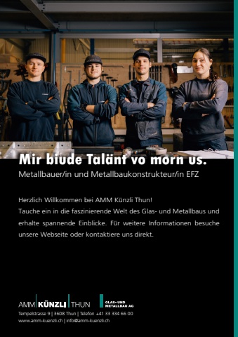meine-region.ch Berufsbild 95Tempelstrasse 9 | 3608 Thun | Telefon +41 33 334 66 00www.amm-kuenzli.ch | info@amm-kuenzli.chMir biude Tal%u00e4nt vo morn us.Metallbauer/in und Metallbaukonstrukteur/in EFZHerzlich Willkommen bei AMM K%u00fcnzli Thun! Tauche ein in die faszinierende Welt des Glas- und Metallbaus und erhalte spannende Einblicke. F%u00fcr weitere Informationen besuche unsere Webseite oder kontaktiere uns direkt.