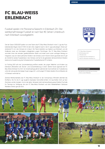 Seit der Saison 2020/2021 spielen nun zwei Teams des FC Blau-Weiss Erlenbach in der 5. Liga des Fuss- ballverbandes Region Zürich FVRZ mit dem Ziel, möglichst rasch in die 4. Liga aufzusteigen. Dieser auf- strebende FC ist in der Schweiz ein Unikum. Die Teams bestehen aus Spielern aus Erlenbach, von der Goldküste sowie aus ehemaligen unbegleiteten jungen Flüchtlingen. Der FC Blau-Weiss Erlenbach vermittelt ihnen die zentralen gesellschaftlichen Werte und leistet somit einen wichtigen Beitrag zur Integration, was von vielen politischen Stellen in der Schweiz und im Kanton Zürich geschätzt wird. Er gilt als Vorbild für weitere Fussballclubs in der Schweiz und hat für die geleisteten (ehrenamtlichen) Arbeiten bereits eine Auszeichnung des Schweizerischen Fussballverbands SFV erhalten.