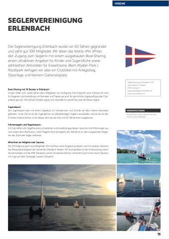 Die Seglervereinigung Erlenbach wurde vor 50 Jahren gegründet und zählt gut 100 Mitglieder. Wir leben das Motto «Wir öffnen den Zugang zum Segeln!» mit einem ausgebauten Boat-Sharing, einem attraktiven Angebot für Kinder und Jugendliche sowie zahlreichen Aktivitäten für Erwachsene. Beim Wyden-Park / Rösslipark verfügen wir über ein Clublokal mit Anlegesteg, Slipanlage und kleinem Gartensitzplatz.