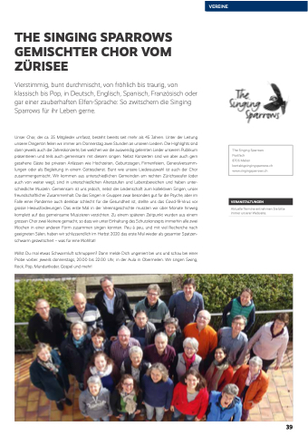 Unser Chor, der ca. 25 Mitglieder umfasst, besteht bereits seit mehr als 45 Jahren. Unter der Leitung unserer Dirigentin feilen wir immer am Donnerstag zwei Stunden an unseren Liedern. Die Highlights sind dann jeweils auch die Jahreskonzerte, bei welchen wir die auswendig gelernten Lieder unserem Publikum präsentieren und teils auch gemeinsam mit diesem singen. Nebst Konzerten sind wir aber auch gern gesehene Gäste bei privaten Anlässen wie Hochzeiten, Geburtstagen, Firmenfeiern, Generalversamm- lungen oder als Begleitung in einem Gottesdienst. Bunt wie unsere Liederauswahl ist auch der Chor zusammengemischt. Wir kommen aus unterschiedlichen Gemeinden am rechten Zürichseeufer (oder auch von weiter weg), sind in unterschiedlichen Altersstufen und Lebensbereichen und haben unter- schiedliche Wurzeln. Gemeinsam ist uns jedoch, nebst der Leidenschaft zum kollektiven Singen, unser freundschaftlicher Zusammenhalt. Da das Singen in Gruppen zwar besonders gut für die Psyche, aber im Falle einer Pandemie auch denkbar schlecht für die Gesundheit ist, stellte uns das Covid-19-Virus vor grosse Herausforderungen. Das erste Mal in der Vereinsgeschichte mussten wir über Monate hinweg komplett auf das gemeinsame Musizieren verzichten. Zu einem späteren Zeitpunkt wurden aus einem grossen Chor zwei kleinere gemacht, so dass wir unter Einhaltung des Schutzkonzepts immerhin alle zwei Wochen in einer anderen Form zusammen singen konnten. Peu à peu, und mit viel Recherche nach geeigneten Sälen, haben wir schlussendlich im Herbst 2020 das erste Mal wieder als gesamter Spatzen- schwarm gezwitschert – was für eine Wohltat!