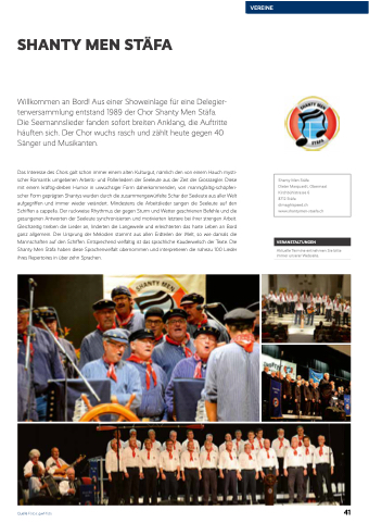 Willkommen an Bord! Aus einer Showeinlage für eine Delegier- tenversammlung entstand 1989 der Chor Shanty Men Stäfa. Die Seemannslieder fanden sofort breiten Anklang, die Auftritte häuften sich. Der Chor wuchs rasch und zählt heute gegen 40 Sänger und Musikanten.