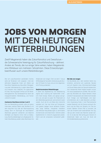 Wer sich zukunftsorientiert weiterbilden möchte, sollte die Tendenzen nicht verpassen. Unter den definierten Megatrends finden sich Wörter wie New Work, Digitalisierung, Gesundheit, Ökologisie- rung oder Individualisierung. In jedem dieser Berei- che entstehen neue Jobprofile: Die sogenannten 4.0-Jobs. Das hat grossen Einfluss auf die Weiter- bildungsbranche. Das Standardseminar weicht der massgeschneiderten Weiterbildung, und Frontal- unterricht ist passé.