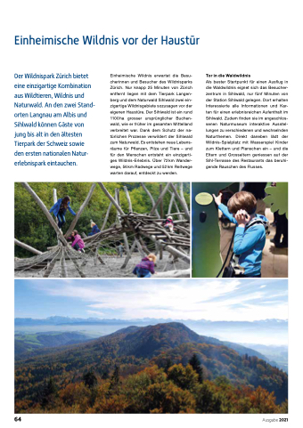 Einheimische Wildnis erwartet die Besu- cherinnen und Besucher des Wildnisparks Zürich. Nur knapp 25 Minuten von Zürich entfernt liegen mit dem Tierpark Langen- berg und dem Naturwald Sihlwald zwei ein- zigartige Wildnisgebiete sozusagen vor der eigenen Haustüre. Der Sihlwald ist ein rund 1100 ha grosser ursprünglicher Buchen- wald, wie er früher im gesamten Mittelland verbreitet war. Dank dem Schutz der na- türlichen Prozesse verwildert der Sihlwald zum Naturwald. Es entstehen neue Lebens- räume für Pflanzen, Pilze und Tiere – und für den Menschen entsteht ein einzigarti- ges Wildnis-Erlebnis. Über 72 km Wander- wege, 56 km Radwege und 52 km Reitwege warten darauf, entdeckt zu werden.