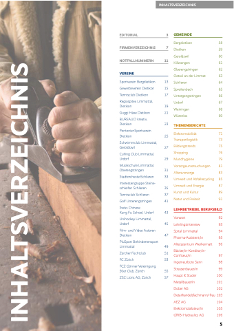 EDITORIAL 3 FIRMENVERZEICHNIS 7 NOTFALLNUMMERN 11 VEREINE Sportverein Bergdietikon 13 Gewerbeverein Dietikon 15 Tennisclub Dietikon 17 Regiospitex Limmattal, Dietikon 19 Guggi Häxe Dietikon 21 BUREAU.D kreativ, Dietikon 23 Pontonier-Sportverein Dietikon 25 Schwimmclub Limmattal, Geroldswil 27 Curling Club Limmattal, Urdorf 29 Musikschule Limmattal, Oberengstringen 31 StadtorchesterSchlieren 33 Interessengruppe Steine- schleifen Schlieren 35 Tennisclub Schlieren 37 Golf Unterengstringen 41 Swiss Chinese Kung Fu School, Urdorf 43 Unihockey Limmattal, Urdorf 45 Film- und Video Autoren Dietikon 47 PluSport Behindertensport Limmattal 49 Zürcher Fechtclub 51 FC Zürich 53 FCZ Gönner-Vereinigung 50er Club, Zürich 55 ZSC Lions AG, Zürich 57 GEMEINDE Bergdietikon 58 Dietikon 59 Geroldswil 60 Killwangen 61 Oberengstringen 62 Oetwil an der Limmat 63 Schlieren 64 Spreitenbach 65 Untergengstringen 66 Urdorf 67 Weiningen 68 Würenlos 69 THEMENBERICHTE Elektromobilität 71 Transportlogistik 73 Bildungstrends 75 Shopping 76 Mundhygiene 79 Vorsorgeuntersuchungen 81 Altersvorsorge 83 Umwelt und Abfallrecycling 85 Umwelt und Energie 87 Kunst und Kultur 89 Natur und Freizeit 91 LEHRBETRIEBE, BERUFSBILD Vorwort 92 Lehrlingsinterview 93 Spital Limmattal 94 Pharma-Assistent/in 95 Alterszentrum Weihermatt 96 Bäcker/in-Konditor/in- Confiseur/in 97 Ingenieurbüro Senn 98 Strassenbauer/in 99 Haupt & Studer 100 Metallbauer/in 101 Dober AG 102 Detailhandelsfachmann/-frau 103 AEZ AG 104 Elektroinstallateur/in 105 GRIBI Hydraulics AG 106 5 INHALTSVERZEICHNIS INHALTSVERZEICHNIS