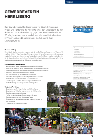 Die Mitglieder des Gewerbevereins engagieren sich für das Dorfleben und bereichern den Alltag von Alt und Jung. Beliebte Treffpunkte sind der Frühlingsmarkt, der Herbstmarkt zusammen mit der Viehschau und der Weihnachtsmarkt. Alle zwei Jahre erfreut der Seniorenausflug (Zusammenarbeit mit der Gemein- de) die älteren Einwohner von Herrliberg. Auch die Weihnachtsbeleuchtung und die alle zirka fünf Jahre stattfindende Gewerbeausstellung HEGA bereichern das Dorfleben.