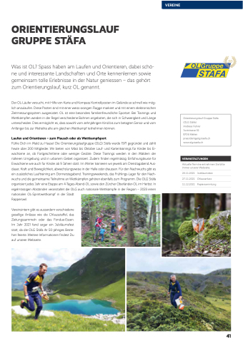 Fühle Dich im Wald zu Hause! Die Orientierungslaufgruppe (OLG) Stäfa wurde 1971 gegründet und zählt heute über 200 Mitglieder. Wir bieten von März bis Oktober Lauf- und Kartentrainings für Kinder bis Er- wachsene an, ob Fortgeschrittene oder weniger Geübte. Diese Trainings werden in den Wäldern der näheren Umgebung und in urbanem Gebiet organisiert. Zudem finden regelmässig Einführungskurse für Erwachsene wie auch für Kinder ab 9 Jahren statt. Im Winter trainieren wir jeweils am Dienstagabend Aus- dauer, Kraft und Beweglichkeit, abwechslungsweise in der Halle oder draussen. Für den Nachwuchs gibt es ein zusätzliches Lauftraining am Donnerstagabend. Trainingsweekends, das Frühlings-Lager für den Nach- wuchs und die gemeinsame Teilnahme an Wettkämpfen gehören ebenfalls zum Programm. Die OLG Stäfa organisiert jedes Jahr eine Etappe am 4-Tages-Abend-OL sowie den Zürcher Oberländer-OL im Herbst. In regelmässigen Abständen veranstaltet die OLG auch nationale Wettkämpfe in der Region – 2023 einen nationalen OL-Sprintwettkampf in der Stadt
