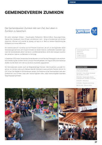 In September 2015 hat der Vorstand des Gemeindevereins mit viel Elan das Pilotprojekt für eine wöchent- liche Dorfzeitung (Der Zumiker) lanciert und auch finanziell gefördert. Seit August 2016 ist der kostenlose «Zolliker Zumiker Bote» nicht mehr aus Zumikons Haushalten wegzudenken.