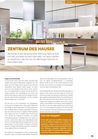 Ob Sie selbst gern den Kochlöffel schwingen oder ob Sie als perfekter Gastgeber gern anrichten und präsentieren, vielleicht auch nur eine schöne Kanne Tee zubereiten wollen: Die Küche ist zentraler Punkt einer Wohnung. Lichtquellen, Materialien, Anord- nung und Auswahl von Küchenmöbeln und Geräten sind bei der Planung unbedingt zu durchdenken.