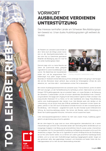 Mit der Lehre beginnt für junge Leute ein neuer, erfahrungsreicher Lebensabschnitt, der in seinen Herausforderungen auf keinen Fall unterschätzt werden darf. Gleichzeitig stehen die Betriebe auch vor einzigartigen Aufgaben in der Betreuung der wirtschaftlichen Zukunft unseres Landes. Unternehmen sind angehalten, sich für eine ganzheitliche Ausbildung und Begleitung einzusetzen und so auch ihre Attraktivität zu steigern. Denn dies ist für Jugendliche ein echter Anhaltspunkt bei der Entscheidung, wo sie ihre Lehre machen wollen; nur so können sich zudem gute persönliche Ausbildungs-Stories entfalten, und nur so kann dem Fachkräftemangel langfristig entgegengewirkt werden. Sorgen wir also gemeinsam dafür, dass gegenseitiger Austausch und Verständnis auf beiden Seiten des Aus- bildungsprozesses sich zu mehr als einer Idealvorstellung entwickeln.