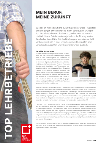 So viele Bereiche und Möglichkeiten stehen zur Wahl. Allein auf dem Portal www.berufsberatung.ch werden mehr als 2200 Berufe vorgestellt und beschrieben. Da finden sich neben vielen bekannten auch viele unbekann- te Berufe wie Orgelbauer, Steinbildhauerin, Architektur- modellbauer, Hufschmiedin oder Winzerin. Aber auch über die Arbeit eines Küfers, einer Theatermalerin oder Vergolderin gibt es hier einiges zu erfahren. Ein wahres Eldorado nicht alltäglicher Tätigkeiten, bei denen man grosse Chancen hat, sich eine eigenständige Zukunft auf- zubauen. Diese Vielfalt an Optionen steht jedoch in kras- sem Widerspruch zu den im Jahr 2020 vom Kanton Zü- rich erhobenen Zahlen. Da wählten 75 % der jungen Männer aus lediglich 25 Berufen und 75 % der Frauen aus gerade mal 10 Berufen ihre Lehre aus.