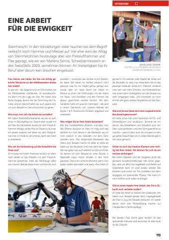 Steinmetz/in: In den Vorstellungen vieler tauchen bei dem Begriff vielleicht noch Hammer und Meissel auf. Viel eher wird der Alltag von SteinmetzInnen heutzutage aber von Presslufthammer und Flex geprägt, wie wir von Marlena Senne, Schweizermeisterin an den SwissSkills 2020, vernehmen können. An Vielseitigkeit hat ihr Beruf aber darum kein bisschen eingebüsst.