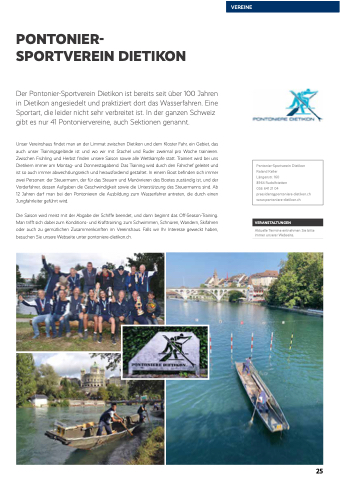 Der Pontonier-Sportverein Dietikon ist bereits seit über 100 Jahren in Dietikon angesiedelt und praktiziert dort das Wasserfahren. Eine Sportart, die leider nicht sehr verbreitet ist. In der ganzen Schweiz gibt es nur 41 Pontoniervereine, auch Sektionen genannt.