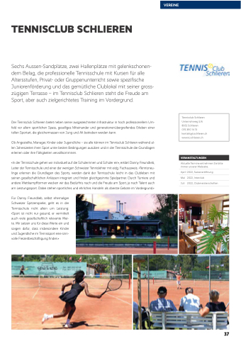 Ob Angestellte, Manager, Kinder oder Jugendliche – sie alle können im Tennisclub Schlieren während al- len Jahreszeiten ihren Sport unter besten Bedingungen ausüben und in der Tennisschule die Grundlagen erlernen oder ihre Fähigkeiten vervollkommnen.