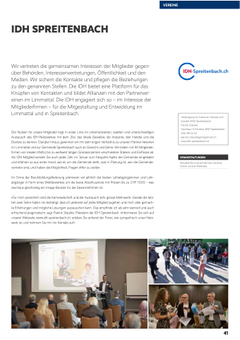 «Für mich persönlich sind die Kameradschaft und der Austausch sehr grosse Mehrwerte. Gerade die letz- ten zwei Jahre haben mir bestätigt, dass ich jederzeit auf jedes Mitglied zugehen und mich über gemach- te Erfahrungen und mögliche Lösungen austauschen kann. Das empfinde ich als sehr wertvoll und auch erfrischend pragmatisch», sagt Patrick Stäuble, Präsident der IDH Spreitenbach. «Informieren Sie sich auf unserer Webseite www.idh-spreitenbach.ch, erleben Sie anhand der Fotos, wie sympathisch unser Netz- werk ist, und nehmen Sie mit mir Kontakt auf.»