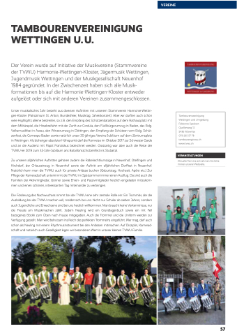 Unser musikalisches Jahr besteht aus diversen Auftritten mit unserem Stammverein Harmonie-Wettin- gen-Kloster (Patrozinium St. Anton, Bundesfeier, Musiktag, Jahreskonzert). Aber wir durften auch schon viele Highlights alleine bestreiten, so z. B. den Empfang des Schützenbataillons auf dem Rathausplatz mit dem Militärspiel, die Hirsebreifahrt mit der Zunft zur Cordula, den Füdlibürgerumzug in Baden, das Eidg. Volksmusikfest in Aarau, den Winzerumzug in Döttingen, den Empfang der Schützen vom Eidg. Schüt- zenfest, die Comexpo Baden sowie natürlich unser 30-jähriges Vereins-Jubiläum auf dem Zentrumsplatz in Wettingen. Als bisheriger absoluter Höhepunkt darf die Romreise im Oktober 2017 zur Schweizer Garde und an die Audienz mit Papst Franziskus bezeichnet werden. Grossartig war aber auch die Reise der TVWU-ler 2019 zum 35-Jahr-Jubiläum ans Bataillonsschützenfest ins Stubaital.