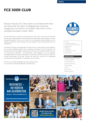 Wir sind der 50er Club – grosse Fans und Gönner des FC Zürich. Nein, wir sind mehr. Wir sind beste Freunde, die sich regelmässig treffen, viele spannende Geschichten erleben, zusammenhalten und unsere Freundschaft geniessen. Und wir sind vor allem eins: eine dynamische Business-Plattform und ein Netzwerk, das Menschen zusammenbringt, die zusammengehören. Weil wir gute Geschäfte lieben und Fussball leben.