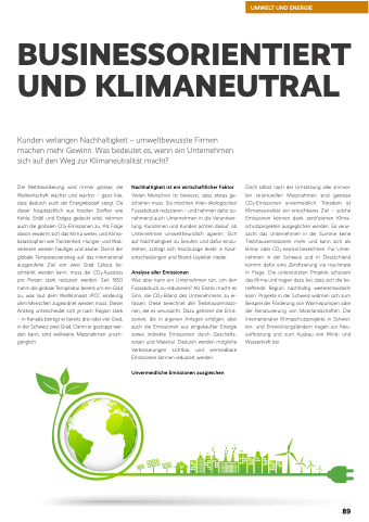 Was aber kann ein Unternehmen tun, um den Fussabdruck zu reduzieren? Als Erstes macht es Sinn, die CO2-Bilanz des Unternehmens zu er- fassen. Diese berechnet alle Treibhausemissio- nen, die es verursacht. Dazu gehören die Emis- sionen, die in eigenen Anlagen erfolgen, aber auch die Emissionen aus eingekaufter Energie sowie indirekte Emissionen durch Geschäfts- reisen und Material. Dadurch werden mögliche Verbesserungen sichtbar, und vermeidbare Emissionen können reduziert werden.