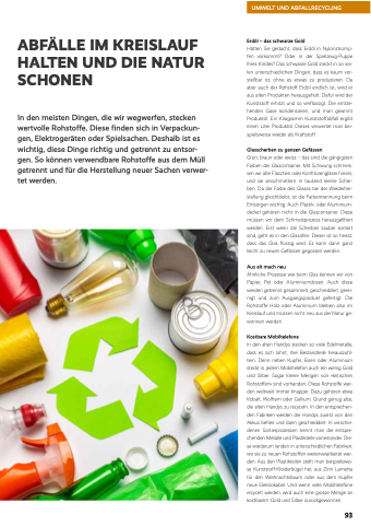 Ähnliche Prozesse wie beim Glas kennen wir von Papier, Pet oder Aluminiumdosen. Auch diese werden getrennt gesammelt, geschreddert, gerei- nigt und zum Ausgangsprodukt gefertigt. Die Rohstoffe Holz oder Aluminium bleiben also im Kreislauf und müssen nicht neu aus der Natur ge- wonnen werden.