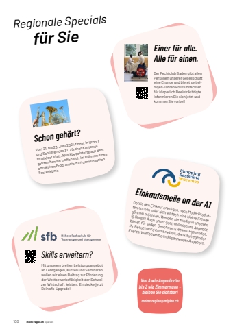 100 meine-region.ch SpecialsRegionale Specials f%u00fcr Sie1 meine-region.ch Von A wie Augen%u00e4rztin bis Z wie Zimmermann %u2013 bleiben Sie sichtbar! meine.region@miplan.chSchon geh%u00f6rt?Vom 21. bis 23. Juni 2024 fi ndet in Urdorf und Schlieren das 31. Z%u00fcrcher Kantonalmusikfest statt. Musikbegeisterte aus dem ganzen Kanton treffen sich im Rahmen eines attraktiven Programms zum gemeinsamen Fest erlebnis.Einer f%u00fcr alle. Alle f%u00fcr einen.Der Fechtclub Baden gibt allen Personen unserer Gesellschaft eine Chance und bietet seit einigen Jahren Rollstuhlfechten f%u00fcr k%u00f6rperlich Beeintr%u00e4chtigte. Informieren Sie sich jetzt und kommen Sie vorbei! Einkaufsmeile an der A1Ob Sie den Einkauf erledigen, nach Mode-Produkten suchen oder sich einfach eine kleine Freude g%u00f6nnen m%u00f6chten. Werden sie f%u00fcndig in unseren 18 Shops! Auch unser gastronomisches Angebot bietet f%u00fcr jeden Geschmack etwas Passendes. Ihr Besuch wird zum Erlebnis, dank aufregender Events, Wettbewerbe und spannender Angebote.Skills erweitern? Mit unserem breiten Leistungsangebot an Lehrg%u00e4ngen, Kursen und Seminaren wollen wir einen Beitrag zur F%u00f6rderung der Wettbewerbsf%u00e4higkeit der Schweizer Wirtschaft leisten. Entdecke jetzt Dein sfb-Upgrade!