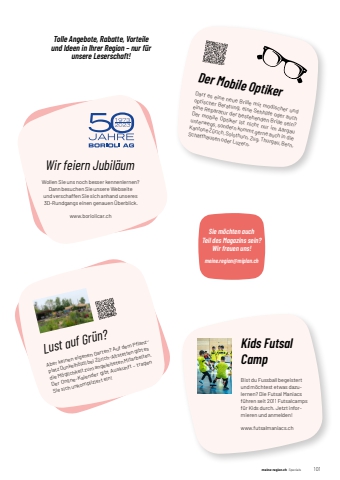 meine-region.ch Specials 101Regionale Specials f%u00fcr Sie1 meine-region.ch SpecialsVon A wie Augen%u00e4rztin bis Z wie Zimmermann %u2013 bleiben Sie sichtbar! meine.region@miplan.chSchon geh%u00f6rt?Vom 21. bis 23. Juni 2024 fi ndet in Urdorf und Schlieren das 31. Z%u00fcrcher Kantonal,musikfest statt. Musikbegeisterte aus dem ganzen Kanton treffen sich im Rahmen eines attraktiven Programms zum gemeinsamen Fest erlebnis.Einer f%u00fcr alle. Alle f%u00fcr einen.Der Fechtclub Baden gibt allen Personen unserer Gesellschaft eine Chance und bietet seit ei,nigen Jahren Rollstuhlfechten f%u00fcr k%u00f6rperlich Beeintr%u00e4chtigte. Informieren Sie sich jetzt und kommen Sie vorbei! Einkaufsmeile an der A1Ob Sie den Einkauf erledigen, nach Mode-Produk,ten suchen oder sich einfach eine kleine Freude g%u00f6nnen m%u00f6chten. Werden sie f%u00fcndig in unseren 18 Shops! Auch unser gastronomisches Angebot bietet f%u00fcr jeden Geschmack etwas Passendes. Ihr Besuch wird zum Erlebnis, dank aufregender Events, Wettbewerbe und spannender Angebote.Skills erweitern? Mit unserem breiten Leistungsangebot an Lehrg%u00e4ngen, Kursen und Seminaren wollen wir einen Beitrag zur F%u00f6rderung der Wettbewerbsf%u00e4higkeit der Schwei,zer Wirtschaft leisten. Entdecke jetzt Dein sfb-Upgrade!meine-region.ch Specials 2Sie m%u00f6chten auch Teil des Magazins sein?Wir freuen uns!meine.region@miplan.chTolle Angebote, Rabatte, Vorteile und Ideen in Ihrer Region %u2013 nur f%u00fcr unsere Leserschaft! Kids Futsal CampBist du Fussball begeistert und m%u00f6chtest etwas dazulernen? Die Futsal Maniacs f%u00fchren seit 2011 Futsalcamps f%u00fcr Kids durch. Jetzt informieren und anmelden!www.futsalmaniacs.chLust auf Gr%u00fcn?Aber keinen eigenen Garten? Auf dem Pfl anzplatz Dunkelh%u00f6lzli bei Z%u00fcrich-Altstetten gibt es die M%u00f6glichkeit zum angeleiteten Mitarbeiten. Der Online-Kalender gibt Auskunft %u2013 tragen Sie sich unkompliziert ein!Wir feiern Jubil%u00e4umWollen Sie uns noch besser kennenlernen? Dann besuchen Sie unsere Webseite und verschaffen Sie sich anhand unseres 3D-Rundgangs einen genauen %u00dcberblick.www.boriolicar.chDer Mobile OptikerDarf es eine neue Brille mit modischer und optischer Beratung, eine Sehhilfe oder auch eine Reparatur der bestehenden Brille sein? Der mobile Optiker ist nicht nur im Aargau unterwegs, sondern kommt gerne auch in die Kantone Z%u00fcrich, Solothurn, Zug, Thurgau, Bern, Schaffhausen oder Luzern.