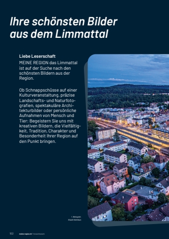 102 meine-region.ch meine-region.ch FotowettbewerbIhre sch%u00f6nsten Bilder aus dem LimmattalLiebe LeserschaftMEINE REGION das Limmattal ist auf der Suche nach den sch%u00f6nsten%u0009Bildern%u0009aus%u0009der%u0009Region. Ob Schnappsch%u00fcsse auf einer Kulturveranstaltung,%u0009pr%u00e4zise%u0009Landschafts- und Naturfotografi%u0009en,%u0009spektakul%u00e4re%u0009Architekturbilder%u0009oder%u0009pers%u00f6nliche%u0009Aufnahmen von Mensch und Tier: Begeistern Sie uns mit kreativen Bildern, die Vielf%u00e4ltigkeit,%u0009Tradition,%u0009Charakter%u0009und%u0009Besonderheit Ihrer Region auf den Punkt bringen.1. Beispiel: Stadt Dietikon
