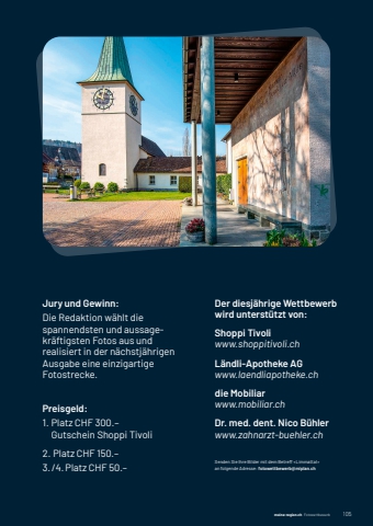 3 meine-region.ch Fotowettbewerb meine-region.ch Fotowettbewerb 1052. Beispiel: Badener Altstadt3. Beispiel: Kirche%u0009Schlieren4. Beispiel: Egelsee Bergdietikonmeine-region.ch Fotowettbewerb 4Jury und Gewinn:Die Redaktion w%u00e4hlt die spannendsten und aussagekr%u00e4ftigsten Fotos aus und realisiert%u0009in%u0009der%u0009n%u00e4chstj%u00e4hrigen%u0009Ausgabe eine einzigartige Fotostrecke. Preisgeld:1.%u0009%u0009%u0009Platz%u0009CHF%u0009300.%u2013%u0009Gutschein Shoppi Tivoli2.%u0009%u0009%u0009Platz%u0009CHF%u0009150.%u2013%u00093.%u0009/4.%u0009Platz%u0009CHF%u000950.%u2013Der diesj%u00e4hrige Wettbewerb wird unterst%u00fctzt von:Shoppi Tivoliwww.shoppitivoli.chL%u00e4ndli-Apotheke AGwww.laendliapotheke.chdie Mobiliarwww.mobiliar.chDr. med. dent. Nico B%u00fchlerwww.zahnarzt-buehler.chSenden%u0009Sie%u0009Ihre%u0009Bilder%u0009mit%u0009dem%u0009Betreff%u0009%u00abLimmattal%u00bb%u0009an folgende Adresse: fotowettbewerb@miplan.ch