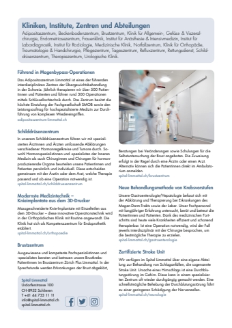 meine-region.ch Inhalt 9SPITALVERBAND LIMMATTALTop Medizin. Pers%u00f6nlich. Individuell.Als bedeutendes Schwerpunktspital mit Ausbildungsauftrag %u00fcbernimmt das Spital Limmattal die medizinische Grundversorgung von j%u00e4hrlich %u00fcber 96%u2019000 Patientinnen und Patienten im Limmattal, Furttal und in den angrenzenden Regionen. Das Spital verf%u00fcgt %u00fcber 188 Betten im Akutbereich, 126%u00a0Bet,ten in der Langzeitpflege, acht Operationss%u00e4le, acht Intensivpflegepl%u00e4tze sowie einen eigenen Rettungs,dienst. Es geh%u00f6rt zu den gr%u00f6ssten Arbeitgebern im Limmattal. Rund 1%u2019600 Mitarbeitende aus 57%u00a0Natio,nen erbringen t%u00e4glich qualitativ hochstehende und vielf%u00e4ltige Leistungen.Das k%u00f6rperliche und seelische Wohlbefinden unserer Patientinnen und Patienten steht stets im Mittelpunkt. Die station%u00e4ren und ambulanten Leistungen, die enge Vernet,zung der verschiedenen Fachgebiete sowie eine indivi,duelle, auf die Patientinnen und Patienten abgestimmte Pflege, garantieren eine gesamtheitliche wie umfassende medizinische Betreuung auf h%u00f6chstem Niveau. Im Sinne der integrierten Versorgung im Limmattal legen wir grossen Wert auf eine enge Partnerschaft mit den niedergelassenen %u00c4rztinnen und %u00c4rzten sowie den vor- und nachsorgenden Institutionen.Berufliche PerspektivenRund 1%u2019600 Mitarbeitende erbringen t%u00e4glich qualitativ hochstehende und vielf%u00e4ltige Leistungen. Mit beinahe 20 Fachbereichen bietet das Spital Limmattal vielseitige beruf,liche M%u00f6glichkeiten und moderne Arbeitsbedingungen f%u00fcrMenschen jeglicher Herkunft und Sprachen. Als Aus,bildungs- und Lehrbetrieb f%u00f6rdern wir qualifizierte Fach,kr%u00e4fte im Gesundheitswesen weit %u00fcber die Region hinaus. Wir unterst%u00fctzen unsere Mitarbeitenden beim Erwerb beruflicher und pers%u00f6nlicher Kompetenzen, damit sie%u00a0sich weiterentwickeln und entfalten k%u00f6nnen.Attraktive RegionDas Limmattal ist eine dynamische und vielf%u00e4ltige Region mit wirtschaftlichem Zukunftspotenzial, unmittelbar an,grenzend an die Stadt Z%u00fcrich. Es bietet zahlreiche Nah,erholungsgebiete, Einkaufsm%u00f6glichkeiten und Sportanlagen in attraktiven Lebensr%u00e4umen. Das Spital Limmattal ist mit %u00f6ffentlichen sowie privaten Verkehrsmitteln sehr gut erreich,bar. Der Spitalverband ist mit seinen drei Betriebseinheiten Akutspital, Pflegezentrum und Rettungsdienst bestens ge,r%u00fcstet f%u00fcr zuk%u00fcnftige Herausforderungen.Kliniken, Institute, Zentren und AbteilungenAdipositaszentrum, Beckenbodenzentrum, Brustzentrum, Klinik f%u00fcr Allgemein-, Gef%u00e4ss- & Viszeralchirurgie, Endometriosezentrum, Frauenklinik, Institut f%u00fcr An%u00e4sthesie & Intensivmedizin, Institut f%u00fcr Labordiagnostik, Institut f%u00fcr Radiologie, Medizinische Klinik, Notfallzentrum, Klinik f%u00fcr Orthop%u00e4die, Traumatologie & Handchirurgie, Pflegezentrum, Tageszentrum, Refluxzentrum, Rettungsdienst, Schilddr%u00fcsenzentrum, Therapiezentrum, Urologische Klinik.F%u00fchrend in Magenbypass-OperationenDas Adipositaszentrum Limmattal ist eines der f%u00fchrenden interdisziplin%u00e4ren Zentren der %u00dcbergewichtsbehandlung in der Schweiz. J%u00e4hrlich therapieren wir %u00fcber 500 Patientinnen und Patienten und f%u00fchren rund 300%u00a0Operationen mittels Schl%u00fcssellochtechnik durch. Das Zentrum besitzt die h%u00f6chste Einstufung der Fachgesellschaft SMOB sowie den Leistungsauftrag f%u00fcr hochspezialisierte Medizin zur Durchf%u00fchrung von komplexen Wiedereingriffen. adipositaszentrum-limmattal.chSchilddr%u00fcsenzentrumIn unserem Schilddr%u00fcsenzentrum f%u00fchren wir mit spezialisierten %u00c4rztinnen und %u00c4rzten umfassende Abkl%u00e4rungen verschiedener Hormonregelkreise und Tumore durch. Sowohl Hormonspezialistinnen und -spezialisten der Inneren Medizin als auch Chirurginnen und Chirurgen f%u00fcr hormonproduzierende Organe beurteilen unsere Patientinnen und Patienten pers%u00f6nlich und individuell. Diese entscheiden gemeinsam mit der %u00c4rztin oder dem Arzt, welche Therapie passend und ob eine Operation notwendig ist. spital-limmattal.ch/schilddruesenzentrumModernste Medizintechnik %u2013 Knieimplantate aus dem 3D-DruckerMassgeschneiderte Knie-Implantate mit Einzelteilen aus dem 3D-Drucker %u2013 diese innovative Operationstechnik wird in der Orthop%u00e4dischen Klinik mit Routine angewandt. Die Klinik hat sich als Kompetenzzentrum f%u00fcr Endoprothetik etabliert. spital-limmattal.ch/orthopaedieBrustzentrumAusgewiesene und kompetente Fachspezialistinnen und -spezialisten beraten und betreuen unsere BrustkrebsPatientinnen im Brustzentrum Z%u00fcrich Plus Limmattal. In der Sprechstunde werden Erkrankungen der Brust abgekl%u00e4rt, Beratungen bei Ver%u00e4nderungen sowie Schulungen f%u00fcr die Selbstuntersuchung der Brust angeboten. Die Zuweisungerfolgt in der Regel durch eine %u00c4rztin oder einen Arzt. Alternativ k%u00f6nnen sich die Patientinnen direkt im Ambulatorium anmelden. spital-limmattal.ch/brustzentrumNeue Behandlungsmethode von KrebsvorstufenUnsere Gastroenterologie/Hepatologie befasst sich mit der Abkl%u00e4rung und Therapierung bei Erkrankungen des Magen-Darm-Trakts sowie der Leber. Unser Fachpersonal mit langj%u00e4hriger Erfahrung untersucht, ber%u00e4t und betreut die Patientinnen und Patienten. Dank des medizinischen Fortschritts sind heute viele Krankheiten effizient und schonend therapierbar. Ist eine Operation notwendig, wird der Fall jeweils interdisziplin%u00e4r mit der Chirurgie besprochen, um die bestm%u00f6gliche Therapie zu erzielen.spital-limmattal.ch/gastroenterologieZertifizierte Stroke UnitWir verf%u00fcgen im Spital Limmattal %u00fcber eine eigene Abteilung zur Behandlung von Schlaganf%u00e4llen, die sogenannte Stroke Unit. Ursache eines Hirnschlags ist eine Durchblutungsst%u00f6rung im Gehirn. Diese kann in einem spezialisierten Zentrum oft wieder durchg%u00e4ngig gemacht werden. Eine schnellstm%u00f6gliche Behebung der D