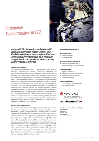meine-region.ch meine-region.chBerufsbilder Berufsbild 1151AutomobilMechatroniker/in EFZAutomobil-Mechatroniker und AutomobilMechatronikerinnen f%u00fchren System- und Funktionspr%u00fcfungen sowie einfache Diagnosearbeiten bei Personenwagen oder Nutzfahrzeugen durch. Sie reparieren Motor, Antrieb, Fahrwerk und Elektronik.Service und KontrolleAutomobilmechatroniker/innen EFZ pr%u00fcfen und halten Motoren, Antriebe, Fahrwerke sowie Elektrik-, Elektronik-, Sicherheits- und Komfortsysteme instand. Dabei verwenden sie computergest%u00fctzte Mess- und Testsysteme. Mit der Hilfe spezieller Ger%u00e4te testen sie Kraftstoffeinspritzsysteme und nehmen Systemeinstellungen sowie auch Bremsmessungen vor. Elektronische Bestandteile des Fahrwerks %u2013 beispielsweise Bremsassistenten %u2013 werden %u00fcberpr%u00fcft. Automobilmechatroniker/innen pr%u00fcfen die Fl%u00fcssigkeitsst%u00e4nde in Schmier-, K%u00fchl- und Bremssystemen, wechseln %u00d6l, schmieren bewegliche Teile am Motor mit Fett und reinigen Motoren, Fahrwerke und Karosserien. Sie kontrollieren Reifenzustand, Aufh%u00e4ngung, Stossd%u00e4mpfer und Lenkung, ersetzen abgen%u00fctzte Reifen und stellen die Lenkung und Ventile ein. Ebenfalls werden Klimaanlage, K%u00fchl-, Z%u00fcnd- und Einspritzsysteme sowie Beleuchtung und Signaleinrichtungen gepr%u00fcft und ersetzt. Automobilmechatroniker/innen f%u00fchren Abgasmessungen durch, nehmen Diagnosen an Abgasreinigungsanlagen vor und halten diese instand.Fehlersuche und ReparaturAutomobilmechatroniker/innen diagnostizieren St%u00f6rungen, suchen die Ursachen und beheben diese. Sie lernen, Fahrerassistenz-, Infotainment-, Hybrid- sowie elektrische Antriebssysteme zu pr%u00fcfen und defekte Bestandteile auszuwechseln. Getriebe oder Antriebswellen werden ein- und ausgebaut, Kupplungen ausgetauscht, der Batteriezustand ausgewertet, Ursachen f%u00fcr Spannungsabfall untersucht, Z%u00fcndanlagen, Leuchten und Anh%u00e4ngerstecker repariert oder eingebaut. Automobilmechatroniker/innen testen Sicherheits- oder Komfortsysteme wie ABS, Airbag oder Tempomat, bauen Navigations- und Daten%u00fcbertragungssysteme wie GPS, Transponder, Ultraschall, Infrarot oder Funk ein, programmieren diese oder passen sie an. Bei Nutzfahrzeugen reparieren sie Hebe- und Ladevor rich tungen. Dabei halten sie stets Umwelt- und Arbeitssicherheitsvorschriften ein und entsorgen Abf%u00e4lle umweltgerecht.Auto Gewerbe Verband Schweiz (AGVS)W%u00f6lfl%u0009istrasse%u00095%u00093006 Bern 031 307 15 15info@agvs.ch www.autoberufe.chAusbildungsdauer 4 JahreFachrichtungen%u2022 Personenwagen%u2022 NutzfahrzeugeBildung in berufl icher Praxis%u2022 In einem Garagenbetrieb f%u00fcr Per sonenwagen / NutzfahrzeugeAnforderungen%u2022 logisches Denken%u2022 hohes technisches Verst%u00e4ndnis%u2022 handwerkliches Geschick%u2022 Selbstst%u00e4ndigkeitSchulische Bildung %u2022 1 bis 1 %u00bd Tage pro Woche an der BerufsfachschuleALLES UNTER EINEM DACHSPENGLEREI %u2022 SPRITZWERK %u2022 MECHANIK %u2022 PNEUHAUSSeit 1973 sind wir Ihr Partner in der Region Mutschellen. Stetig haben wir unser Angebot wie auch unsere Infrastruktur ausgebaut.Nehmen Sie mit uns Kontakt auf!Grossmattstrasse 26 | 8964 Rudolfstetten056 633 64 74 | info@boriolicar.ch | www.boriolicar.ch