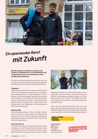 116 meine-region.ch Top Lehrbetrieb meine-region.ch Top Lehrbetriebe 1Haupt + Studer AGWagistrasse 78952 Schlieren044 755 66 77info@haupt-studer.chwww.haupt-studer.chEin spannender Beruf mit ZukunftStell Dir einmal vor, was bei Dir zu Hause, in der Schule, im Einkaufszentrum, im Gesch%u00e4ftshaus oder im Spital ohne Strom noch funktionieren w%u00fcrde %u2026Die Welt w%u00fcrde stillstehen!Fachleute der Elektroinstallationsbranche sorgen daf%u00fcr, dass Energie und Daten einwandfrei genutzt werden k%u00f6nnen. Auf sie ist Verlass, heute und in Zukunft.T%u00e4tigkeiten Elektrofachleute sind f%u00fcr den Aufbau und Unterhalt von elektrischen Installationen verantwortlich. Sie arbeiten auf der Baustelle oder in fertigen Geb%u00e4uden, in Wohn-, Arbeits- und Industrieanlagen. Der Beruf ist vielseitig: vom Verlegen von Leitungen bis hin zum Anschluss von teilweise komplizierten Ger%u00e4ten. Manchmal werden gr%u00f6bere Arbeiten ausgef%u00fchrt (z. B. Rohrverlegung im Rohbau), aber auch T%u00e4tigkeiten mit Fingerspitzengef%u00fchl sind oftmals gefragt. ArbeitsumfeldElektroinstallateur/innen f%u00fchren Auftr%u00e4ge drinnen sowie im Freien aus. Dabei arbeiten sie selbstst%u00e4ndig, aber auch im Team. Zudem bringen die verschiedenen Arbeitspl%u00e4tze sowie der Kontakt mit der Kundschaft zus%u00e4tzliche Abwechslung. Eine Lehre bei unsWir bilden rund zw%u00f6lf Lernende in den Berufen Elektroinstallateur/in und Montage-Elektriker/in aus. Unsere Lernenden profi tieren von vielen Pluspunkten: Dazu z%u00e4hlen abwechslungsreiche Arbeiten, grosse Selbstst%u00e4ndigkeit und enge, pers%u00f6nliche Betreuung von Lehrbeginn bis Lehrende. Unsere Unternehmung geh%u00f6rt seit 2007 in die Baumann Koelliker Gruppe. Zur Unterst%u00fctzung bieten wir unseren Lernenden zusammen mit der ganzen Gruppe diverse, wertvolle Ausbildungsschwerpunkte an. Haben wir Dein Interesse geweckt? Dann schau bei haupt-studer.ch oder bei wunschberuf.ch rein! Denn Elektroinstallateur/innen sind gesuchte Fachkr%u00e4fte. Ausserdem gibt es viele Weiterbildungsm%u00f6glichkeiten.
