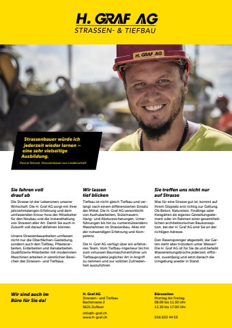118 meine-region.ch BerufsbildStrassenbauer w%u00fcrde ichjederzeit wieder lernen %u2013eine sehr vielseitigeAusbildung.Pascal St%u00f6ssel, Strassenbauer aus LeidenschaftSie fahren voll drauf abDie Strasse ist der Lebensnerv unserer Wirtschaft. Die H. Graf AG sorgt mit ihrer jahrzehntelangen Erfahrung und dem umfassenden Know-how der Mitarbeiter f%u00fcr den Neubau und die Instandhaltung von Strassen aller Art. Damit Sie auch in Zukunft voll darauf abfahren k%u00f6nnen.Unsere Strassenbauarbeiten umfassen nicht nur die Oberfl %u00e4chen-Gestaltung, sondern auch den Tiefbau, Pfl asterarbeiten, Erdarbeiten und Kanalarbeiten. Qualifi zierte Mitarbeiter mit modernsten Maschinen arbeiten in s%u00e4mtlichen Bereichen des Strassen- und Tiefbaus.Wir lassen tief blickenTiefbau ist nicht gleich Tiefbau und verlangt nach einem diffl erenzierten Einsatz der Mittel. Die H. Graf AG verwirklicht von Aushubarbeiten, St%u00fctzmauern, Hang- und Absturzsicherungen, Unterf%u00fchrungen bis hin zu %u00abunterst%u00fctzenden%u00bb Massnahmen im Strassenbau. Alles mit der notwendigen Erfahrung und Kompetenz.Die H. Graf AG verf%u00fcgt %u00fcber ein erfahrenes Team. Vom Tiefbau-Ingenieur bis hin zum virtuosen Baumaschinenf%u00fchrer um Tiefbauprojekte jeglicher Art in Angriffl zu nehmen und zur vollsten Zufriedenheit auszuf%u00fchren.Sie trefi en uns nicht nur auf StrasseWas f%u00fcr eine Strasse gut ist, kommt auf Ihrem Sitzplatz erst richtig zur Geltung.Ob Beton, Naturstein, Findlinge oder Kiesg%u00e4rten als eigenes Gestaltungselement oder im Rahmen einer gesamtheitlichen architektonischen Baukonzeption, bei der H. Graf AG sind Sie an der richtigen Adresse.Den Rasensprenger abgestellt, der Garten steht aber trotzdem unter Wasser! Die H. Graf AG ist f%u00fcr Sie da und behebt Wasserleitungsbr%u00fcche jederzeit, effi zient, zuverl%u00e4ssig und setzt danach die Umgebung wieder in Stand.Wir sind auch im B%u00fcro f%u00fcr Sie da!H. Graf AGStrassen- und TiefbauBachstrasse 25621 Zufi koninfo@h-graf.chwww.h-graf.chB%u00fcrozeitenMontag bis Freitag08.00 bis 11.30 Uhr13.30 bis 17.00 Uhr056 633 44 53