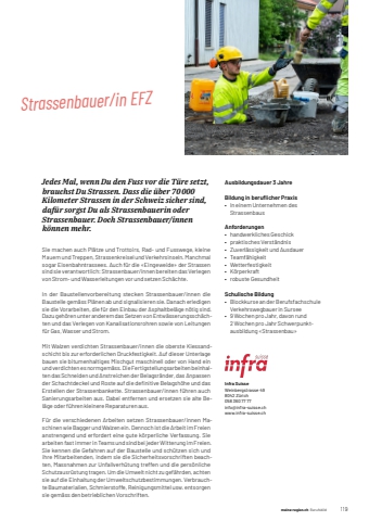 meine-region.ch meine-region.chBerufsbilder Berufsbild 1191Strassenbauer/in EFZJedes Mal, wenn Du den Fuss vor die T%u00fcre setzt, brauchst Du Strassen. Dass die %u00fcber 70 000 Kilometer Strassen in der Schweiz sicher sind, daf%u00fcr sorgst Du als Strassenbauerin oder Strassenbauer. Doch Strassenbauer/innen k%u00f6nnen mehr.Sie machen auch Pl%u00e4tze und Trottoirs, Rad- und Fusswege, kleine Mauern und Treppen, Strassenkreisel und Verkehrsinseln. Manchmal sogar Eisenbahntrassees. Auch f%u00fcr die %u00abEingeweide%u00bb der Strassen sind sie verantwortlich: Strassenbauer/innen bereiten das Verlegen von Strom- und Wasserleitungen vor und setzen Sch%u00e4chte.In der Baustellenvorbereitung stecken Stras senbauer/innen die Baustelle gem%u00e4ss Pl%u00e4nen ab und signalisieren sie. Danach erledigen sie die Vorarbeiten, die f%u00fcr den Einbau der Asphaltbel%u00e4ge n%u00f6tig sind. Dazu geh%u00f6ren unter anderem das Setzen von Entw%u00e4sserungssch%u00e4chten und das Verlegen von Kanalisationsrohren sowie von Leitungen f%u00fcr Gas, Wasser und Strom.Mit Walzen verdichten Strassenbauer/innen die oberste Kiessandschicht bis zur erforderlichen Druckfestigkeit. Auf dieser Unterlage bauen sie bitumenhaltiges Mischgut maschinell oder von Hand ein und verdichten es normgem%u00e4ss. Die Fertigstellungsarbeiten beinhalten das Schneiden und Anstreichen der Belagsr%u00e4nder, das Anpassen der Schachtdeckel und Roste auf die defi nitive Belags h%u00f6he und das Erstellen der Strassenbankette. Strassenbauer/innen f%u00fchren auch Sanierungsarbeiten aus. Dabei entfernen und ersetzen sie alte Bel%u00e4ge oder f%u00fchren kleinere Reparaturen aus.F%u00fcr die verschiedenen Arbeiten setzen Stras senbauer/innen Maschinen wie Bagger und Walzen ein. Dennoch ist die Arbeit im Freien anstrengend und erfordert eine gute k%u00f6rperliche Verfassung. Sie arbeiten fast immer in Teams und sind bei jeder Witterung im Freien. Sie kennen die Gefahren auf der Baustelle und sch%u00fctzen sich und ihre Mitarbeitenden, indem sie die Sicherheitsvorschriften beachten, Massnahmen zur Unfallverh%u00fctung treffen und die pers%u00f6nliche Schutzausr%u00fcstung tragen. Um die Umwelt nicht zu gef%u00e4hrden, achten sie auf die Einhaltung der Umweltschutzbestimmungen. Verbrauchte Baumaterialien, Schmierstoffe, Reinigungsmittel usw. entsorgen sie gem%u00e4ss den betrieblichen Vorschriften.Infra SuisseWeinbergstrasse 498042%u0009Z%u00fcrich%u0009058 360 77 77info@infra-suisse.chwww.infra-suisse.chAusbildungsdauer 3 JahreBildung in berufl icher Praxis%u2022 In einem Unternehmen des StrassenbausAnforderungen%u2022 handwerkliches Geschick%u2022 praktisches Verst%u00e4ndnis%u2022 Zuverl%u00e4ssigkeit und Ausdauer%u2022 Teamf%u00e4higkeit%u2022 Wetterfestigkeit%u2022 K%u00f6rperkraft%u2022 robuste GesundheitSchulische Bildung %u2022 Blockkurse an der Berufsfachschule Verkehrswegbauer in Sursee%u2022 9 Wochen pro Jahr, davon rund 2 Wochen pro Jahr Schwerpunktausbildung %u00abStrassenbau%u00bb