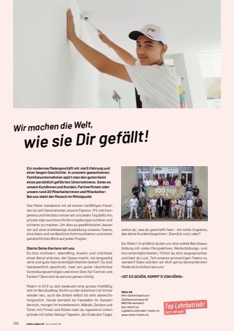 126 meine-region.ch Top Lehrbetrieb meine-region.ch Top Lehrbetriebe 1H%u00f6hn AGHerr Daniel GalantucciStallikonerstrasse 528903 Birmensdorf 044 730 07 44s.galantucci@maler-hoehn.chwww.maler-hoehn.chWir machen die Welt, wie sie Dir gef%u00e4llt!Ein modernes Malergesch%u00e4ft mit viel Erfahrung und einer langen Geschichte: In unserem gewachsenen Familienunternehmen sp%u00fcrt man den guten Geist eines pers%u00f6nlich gef%u00fchrten Unternehmens. Seien es unsere Kundinnen und Kunden, Partnerfi rmen oder unsere rund 20 Mitarbeiterinnen und Mitarbeiter: Bei uns steht der Mensch im Mittelpunkt.Das Maler-Handwerk mit all seinen vielf%u00e4ltigen Facetten ist seit Generationen unsere Passion. Mit viel Kompetenz und Herzblut setzen wir uns jeden Tag daf%u00fcr ein, private oder auch berufl iche Umgebungen sch%u00f6ner und sicherer zu machen. Um dies zu gew%u00e4hrleisten, bauen wir auf eine erstklassige Ausbildung unseres Teams, eine klare und verl%u00e4ssliche Kommunikation und einen ganzheitlichen Blick auf jedes Projekt.Starte Deine Karriere mit unsDu bist motiviert, teamf%u00e4hig, kreativ und m%u00f6chtest einen Beruf erlernen, der Spass macht, nie langweilig wird und gute Karrierem%u00f6glichkeiten bietet? Du bist handwerklich geschickt, hast ein gutes r%u00e4umliches Vorstellungsverm%u00f6gen und einen Sinn f%u00fcr Formen und Farben? Dann bist du bei uns genau richtig.Maler/-in EFZ zu sein bedeutet eine grosse Vielf%u00e4ltigkeit im Berufsalltag. Nicht nur der Arbeitsort ist immer wieder neu, auch die Arbeit selbst ist sehr abwechslungsreich. Heute bemalst du Fassaden im Aussenbereich, morgen im Innenbereich, W%u00e4nde, Decken und T%u00fcren mit Pinsel und Rollen oder du tapezierst Untergr%u00fcnde mit tollen Design-Tapeten. Am Ende des Tages siehst du, was du geschafft hast %u2013 ein tolles Ergebnis, das deine Kunden begeistert. Ziemlich cool, oder?Als Maler/-in erh%u00e4ltst du bei uns eine solide Berufsausbildung mit vielen Perspektiven, Weiterbildungs- und Karrierem%u00f6glichkeiten. F%u00fchlst du dich angesprochen und hast du Lust, Teil unseres grossartigen Teams zu werden? Dann w%u00fcrden wir dich gerne kennenlernen! Melde dich einfach bei uns!%u00abIST ES SCH%u00d6N, KOMMT%u2019S VON H%u00d6HN%u00bb